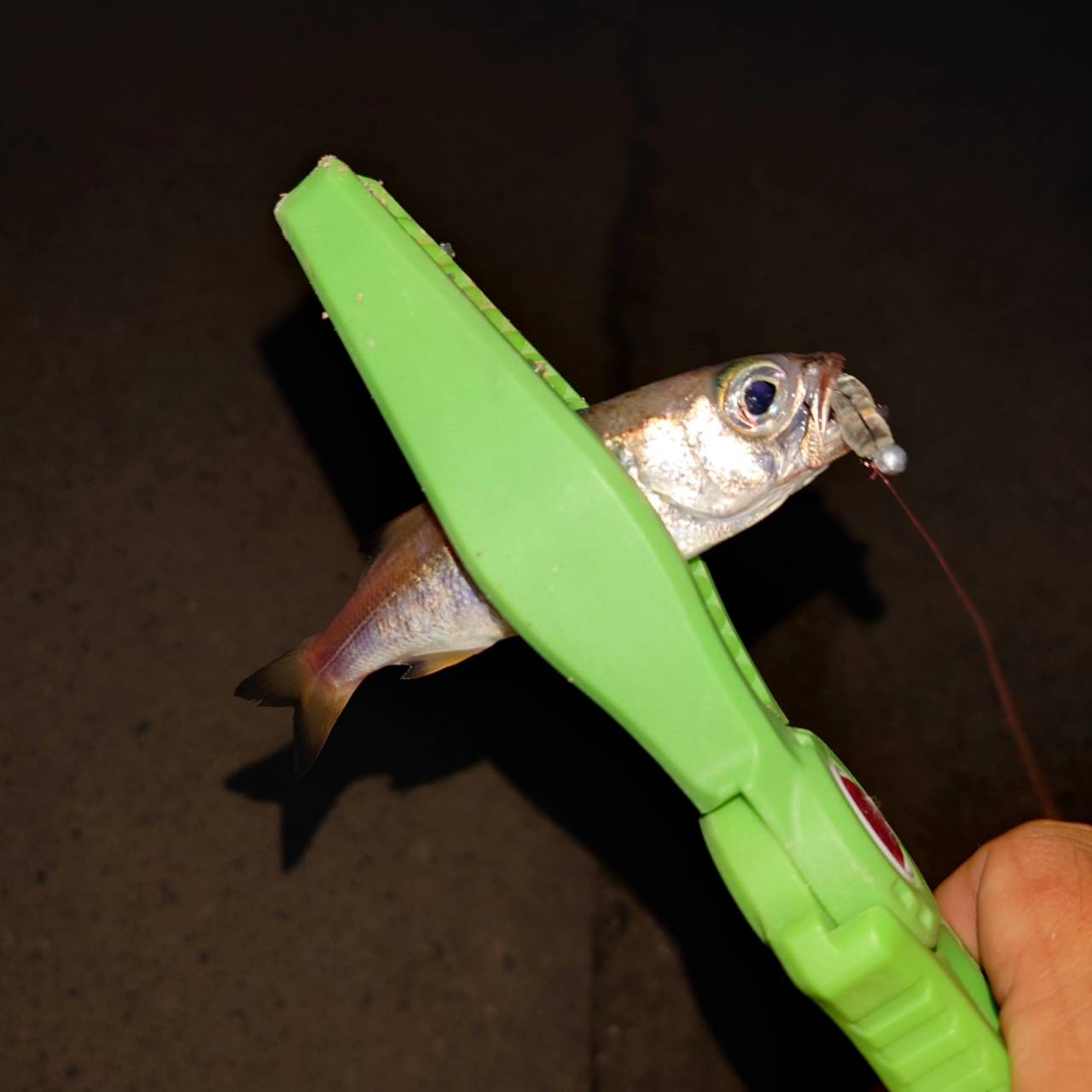 本日は夜からフィッシング遊豊橋店メンバー3人で、浜名湖アジング釣行に行って来ました、ポイントに付いたら水中集魚灯ボルト2を投入して、しばらくするとチラホラアジが見え出しました。ジグヘッドはヤリエのアジメバアーミー0.4gにワームはスミス アジエースを使用しました、投げて2~3回シャクッて、ハンドルを1回転巻きながら釣っているとポツポツとアタリがあり、15cm位のアジを合計で12匹釣れました、ムツも数匹掛りました。他の豊橋店メンバーもアジを釣り上げていました。