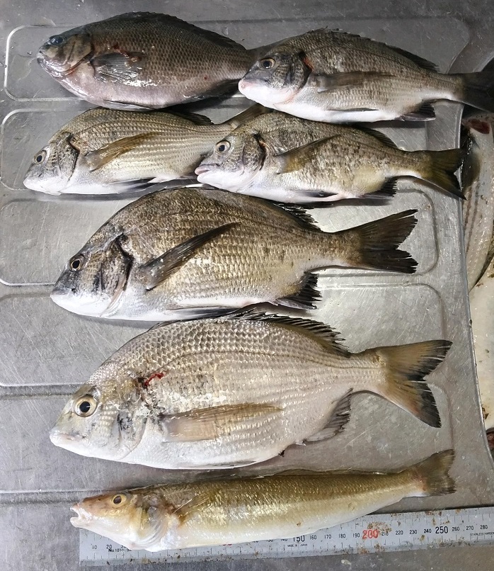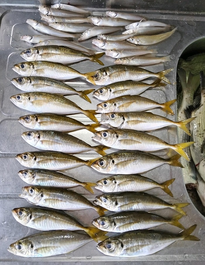 仕事終わりから雨の中北陸へ向かいます。ポイントに着くとすぐにクロダイ小とグレ小が釣れるが反応が出ないので移動してクロダイを追加するがアジのポイントには先行者ありですが雨宿りしているのでポイントに入り投げてみるとアジをポツポツと10匹釣り移動、次の場所に入ってすぐにドス!とロッドが入り上がって来たのはボラでした。すぐに2匹目を追加して2発掛け損ない3匹目と4匹目を追加してアジのポイントを見に行くと車はあるのですが人が見えず投げると渋いがアジが釣れ11匹釣りデカいキス26.5㌢が釣れる。ラストの場所移動でイイサイズのグレを浮かすがバレて一晩目終了です。