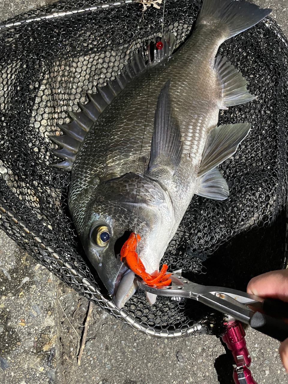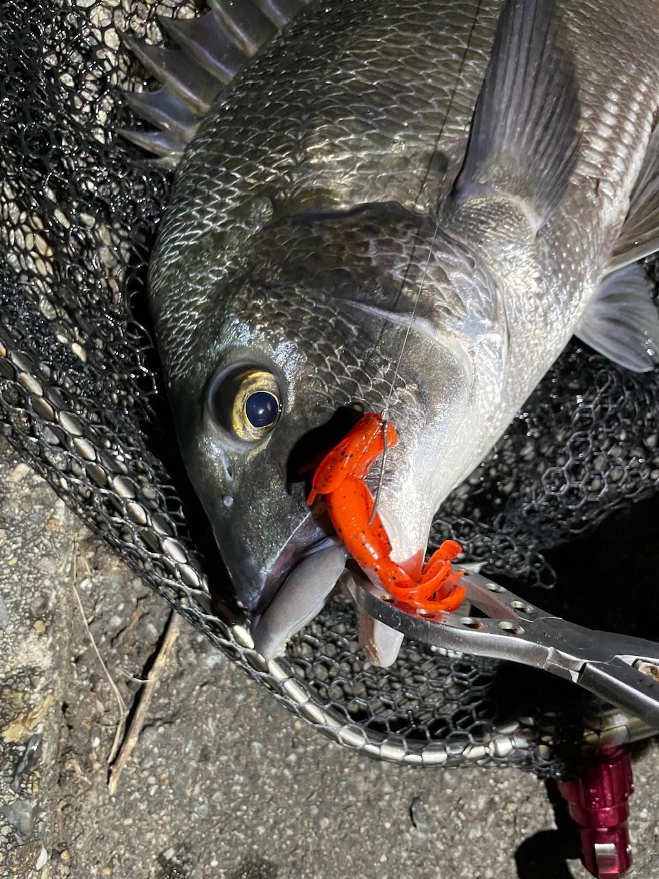 結局宮川へ、、来てしまった、、来たからには釣ろうと思いいつも通りフリーリグをセッティングして開始!すると何度かアタリはあるものののらない、、巻くスピードを先程よりさらにスローにするとまたアタリ!しっかり食い込むの確認してフッキング!35cmくらいの元気なチヌでした!それからアタリがなくなりそのまま終了しました。