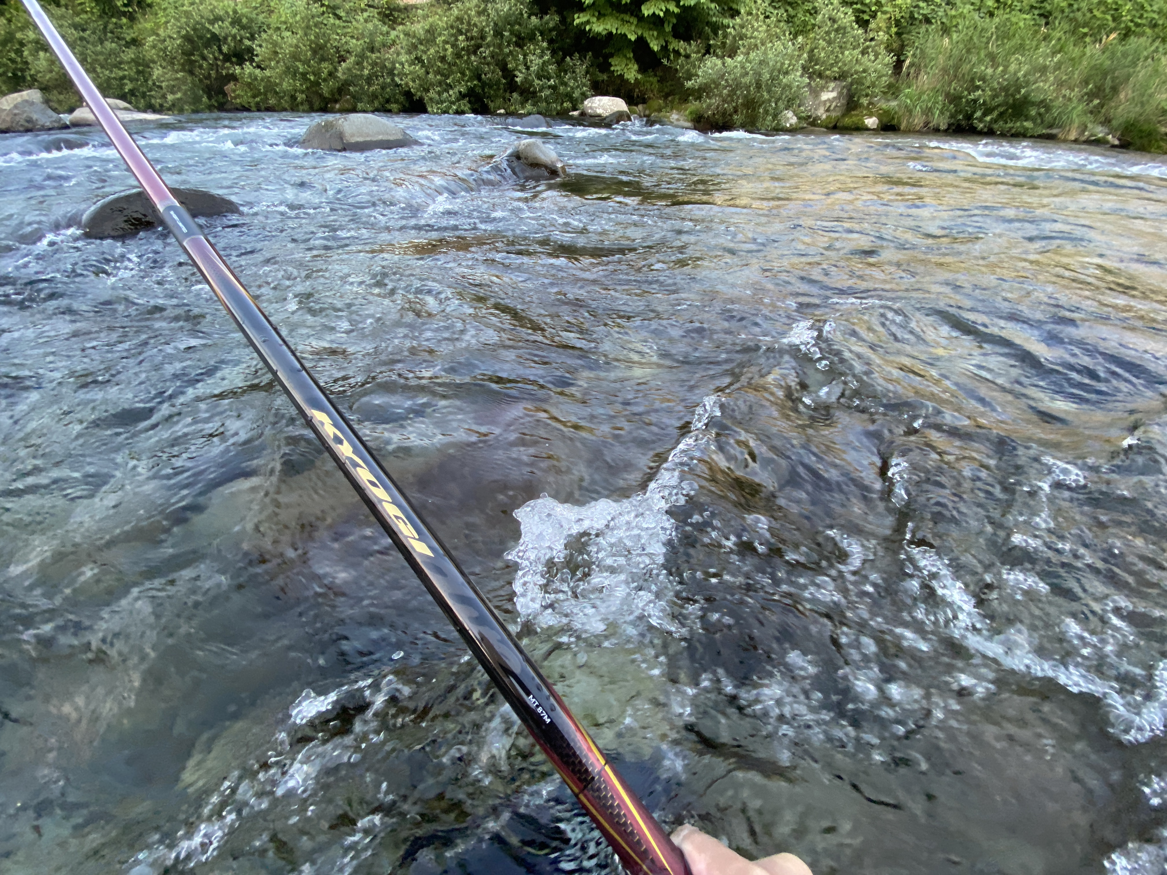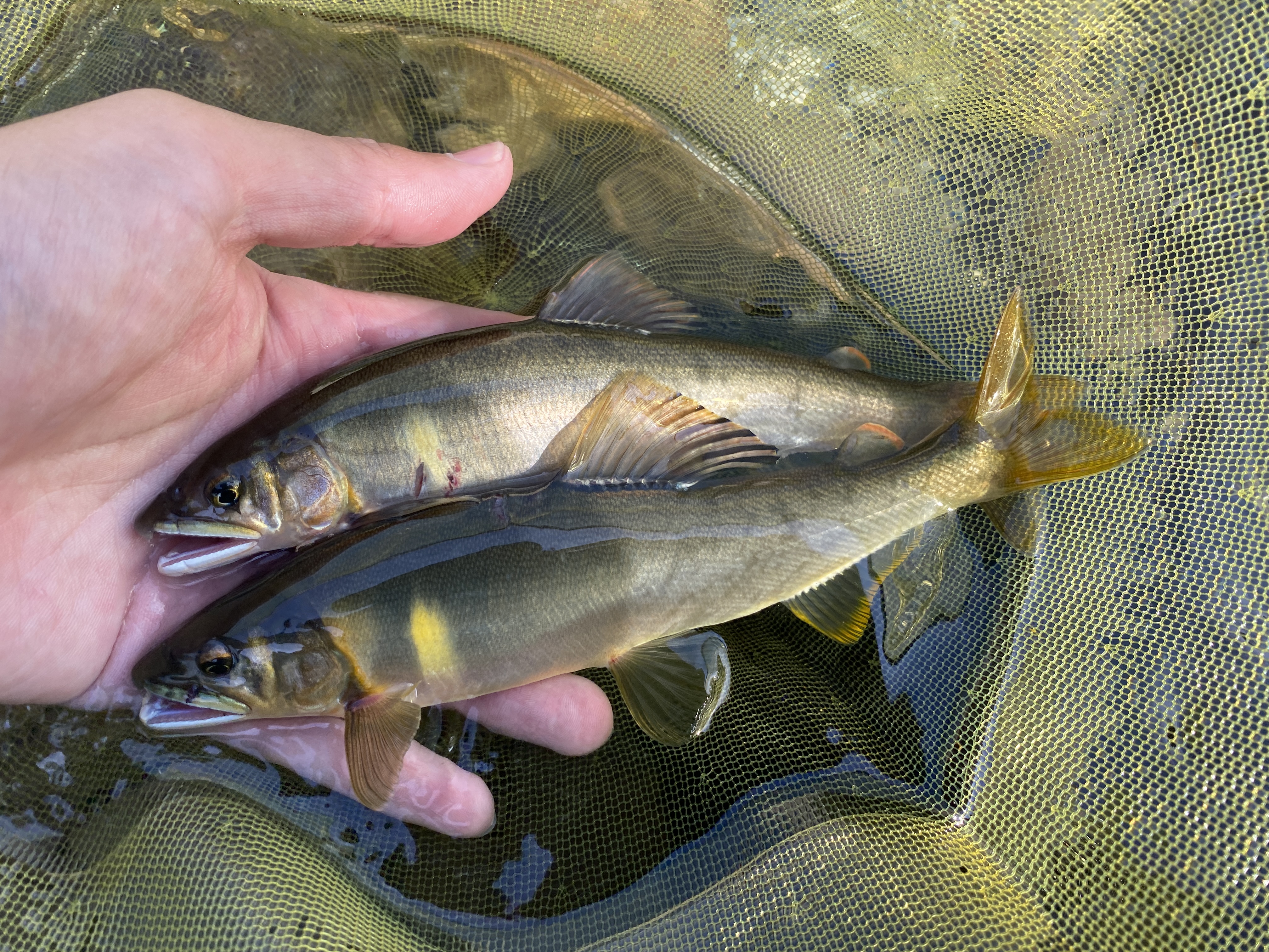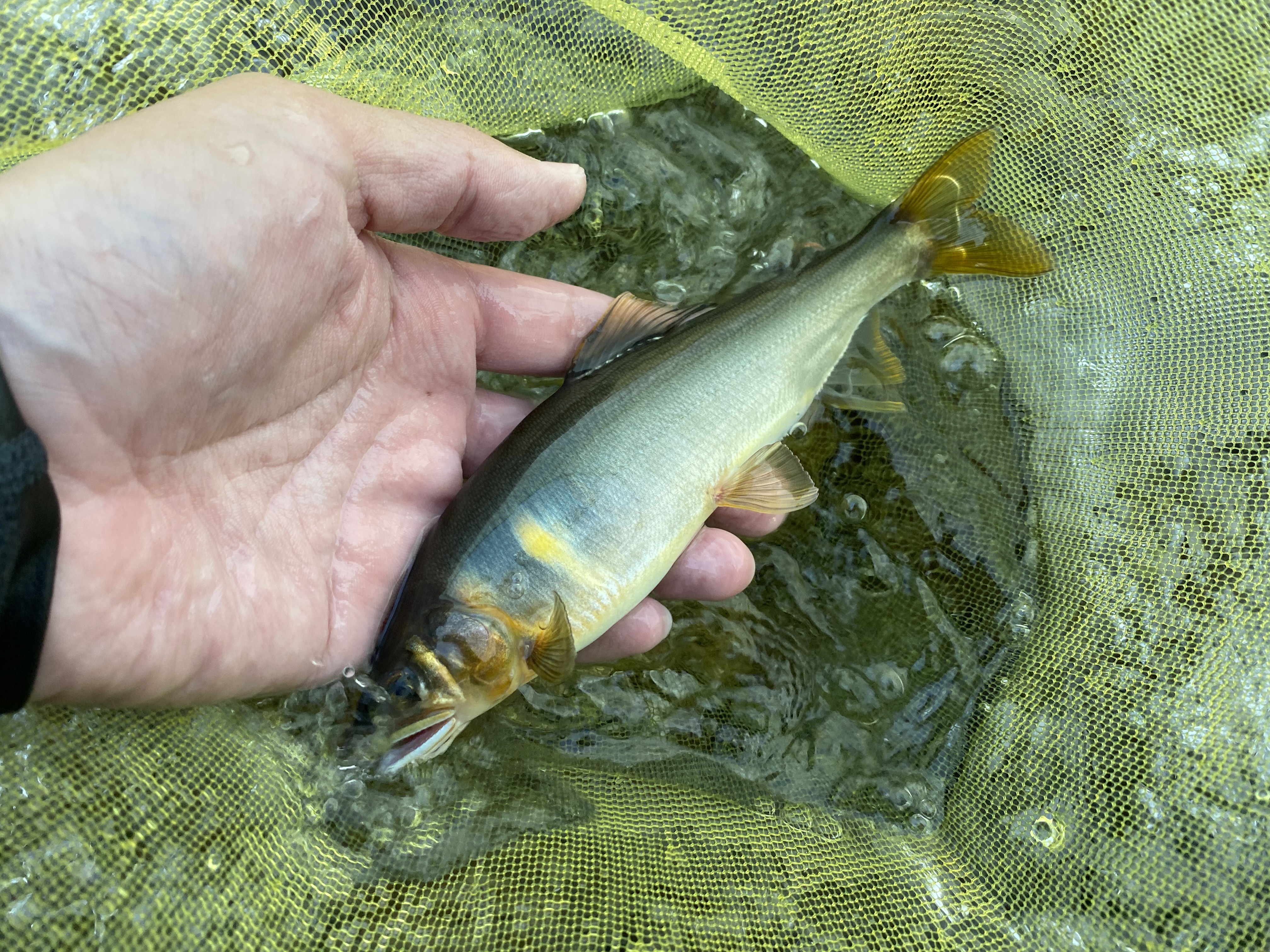 開始早々掛けますがバレ…そのあとウグイのヒットでオトリも元気ないです。早く入れ替えたいところ…。