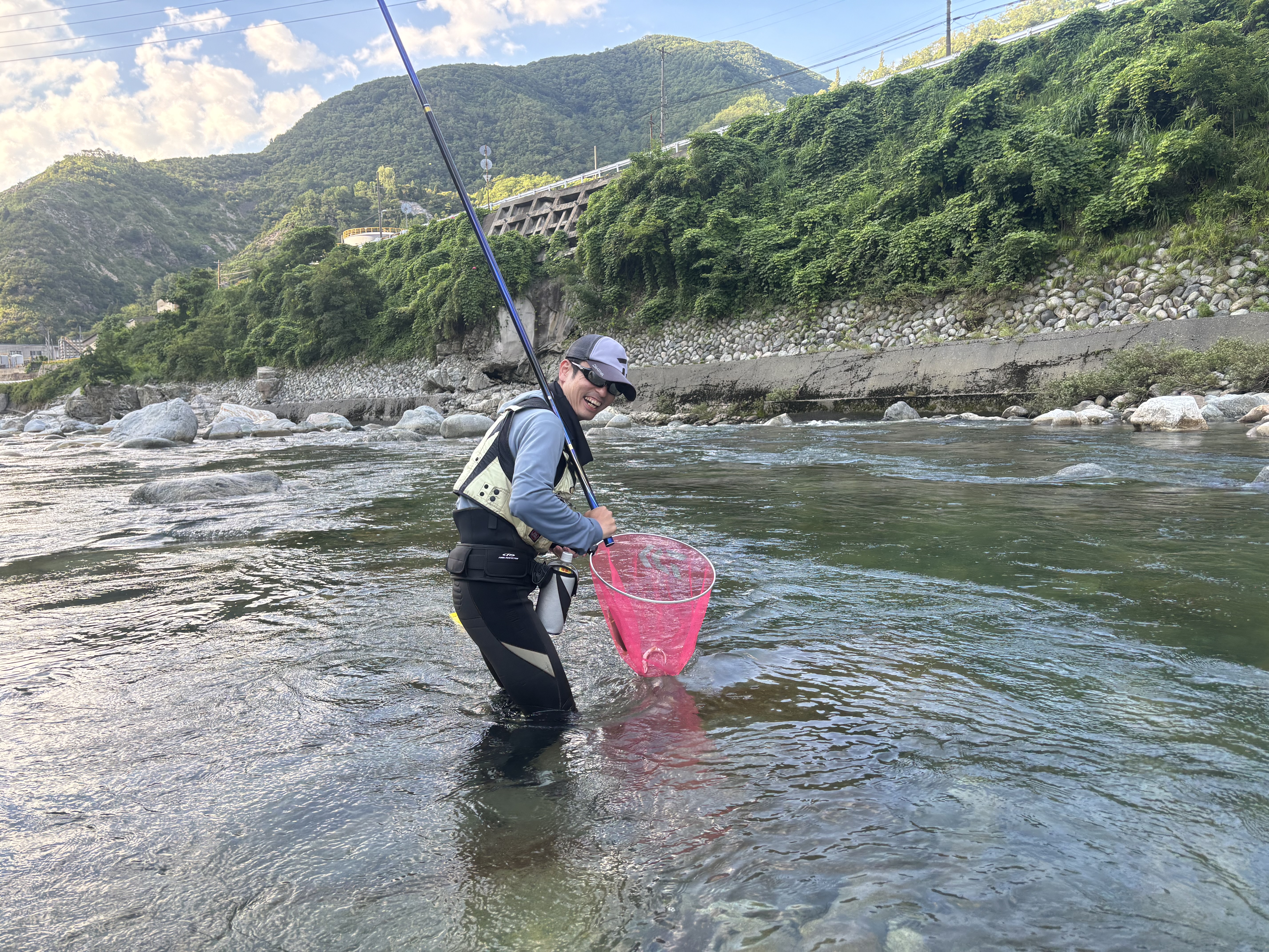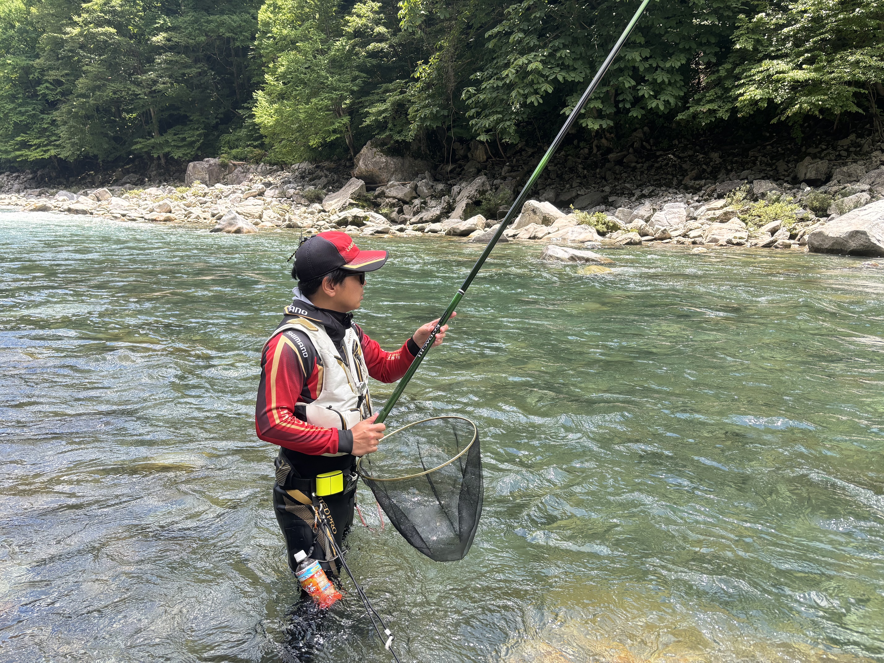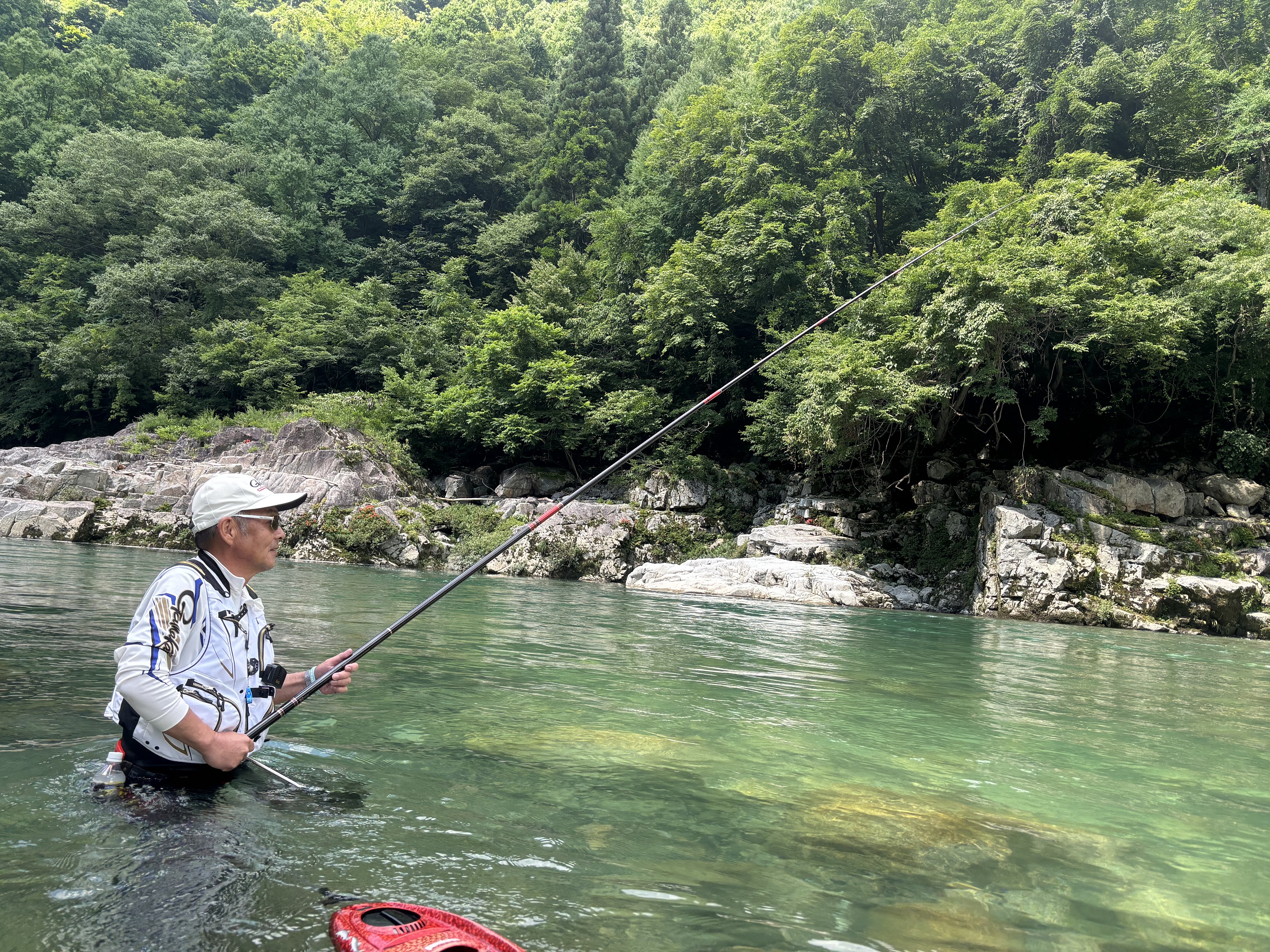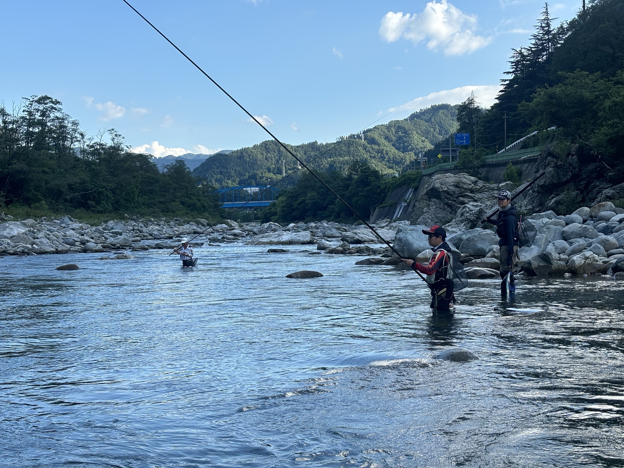 お誘いを頂き2年ぶりに高原川へ行って来ました。水が綺麗で大好きな河川の一つです。もんじろうさんで日券とオトリを購入し東漆山へ行きました。川をみると明らかに白川状態。残り垢パターンです。開始5分ほどで掛かりましたが後が続かずポツリポツリのペースでお昼までに11匹の釣果。一宮店・名手鈴木氏はやはり倍の釣果。お昼にたらふくそうめんを食べ動けない状態でしたがなんとか頑張ります。午後からは別行動していた静岡組(焼津街道店・三浦店長率いる尖鋭部隊)から情報を聞き鉱山下へ。ここは何故か石色が良く釣れそうな感じでした。オトリを送り出すと秒殺で掛かります。16匹追加し合計27匹。照り込んで垢が着けば全体的に楽しめそうです。