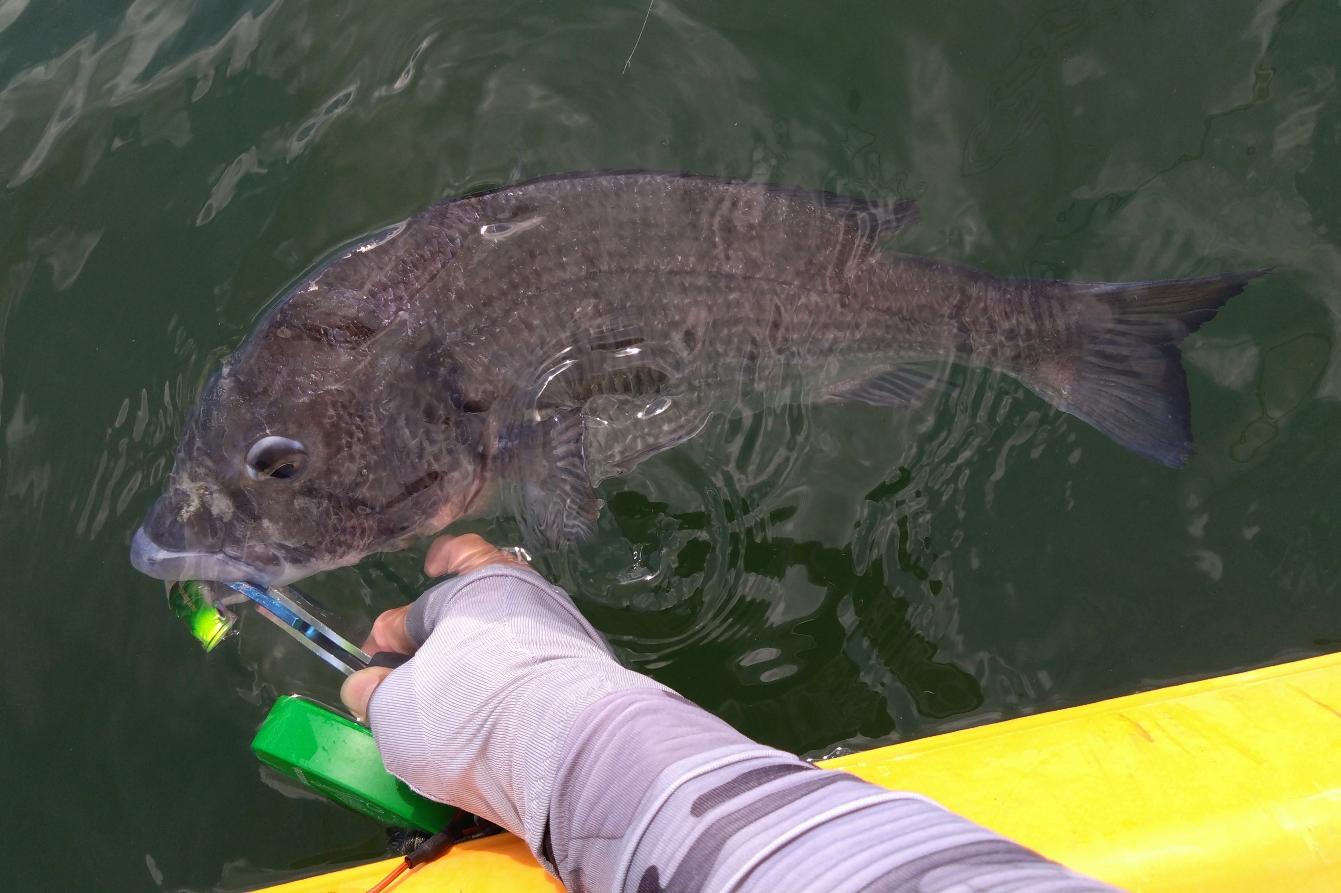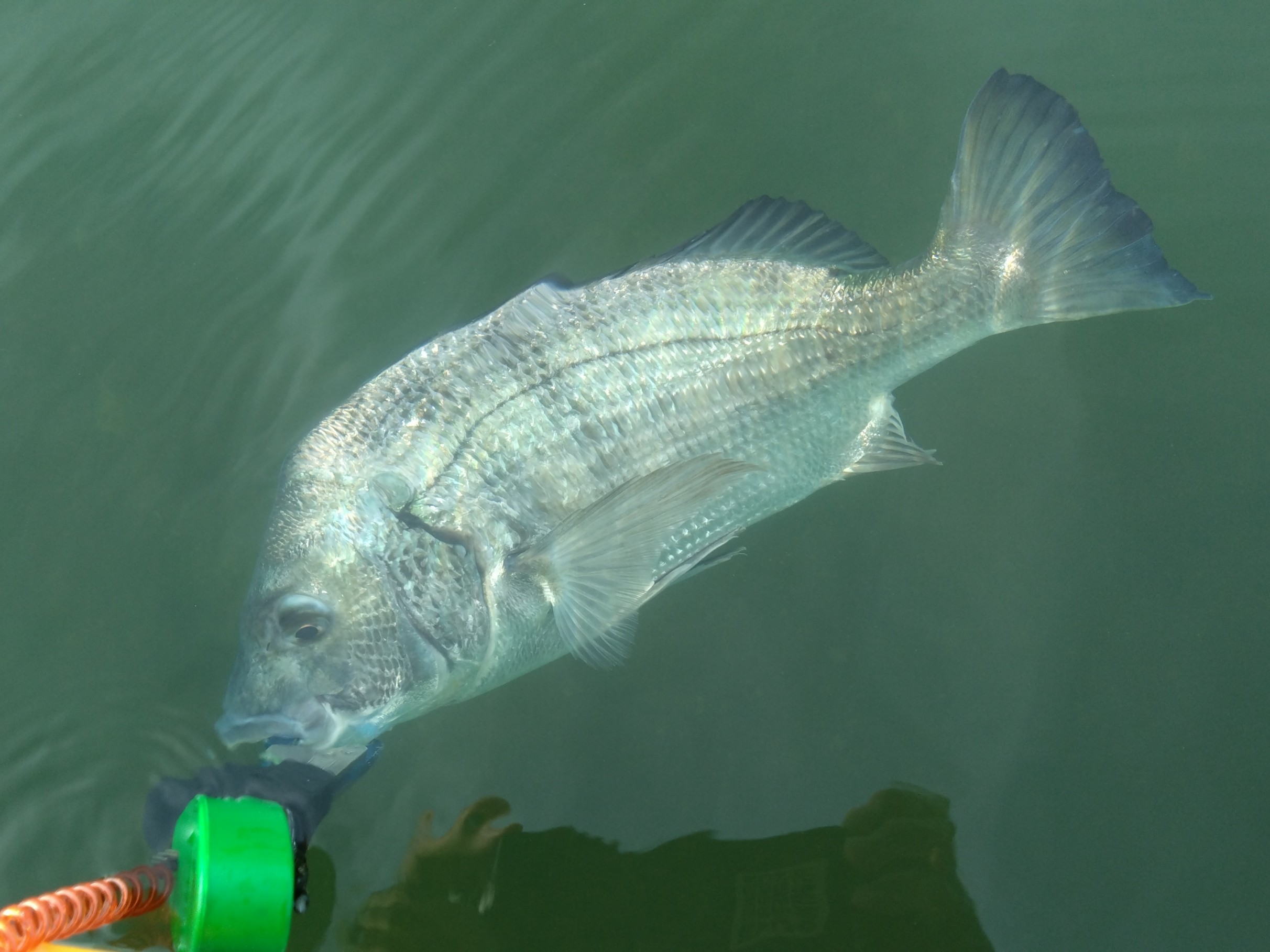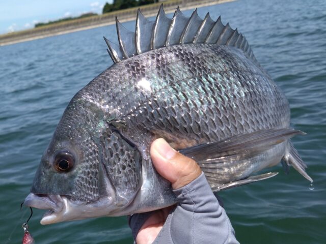 前々日のゲリラ豪雨は、チヌを活性化させるには時間が経ち過ぎていた様で、スタートから渋い状況…。気温水温共に高く熱中症アラートが鳴りまくっています。水上は心地良い夏風が吹き、暑いながらも気持ちの良い環境で釣りが楽しめます♪ 少し風が強まり水面が波立ちはじめると…、チョン…、チョンと軽目のアクションに反応したチヌのチェイスで水面が大きく盛り上がりルアーに反応します!追いつきそうになったタイミングでルアーをチヌから遠ざけて吸込みを誘発!『ガボッ!』と勢い良くルアーにバイトして反転!ヒット!流れの中のファイトはかなりの抵抗でスリルがあります♪ この日はこんな感じで風が吹いたら反応が出てバイトする状況でした。こんな時はやはりジャクソンのRA-POPが最強です、チヌに追わせるトゥイッチ直後のストップが早くテールを振らないルアーはRA-POPが1番です。