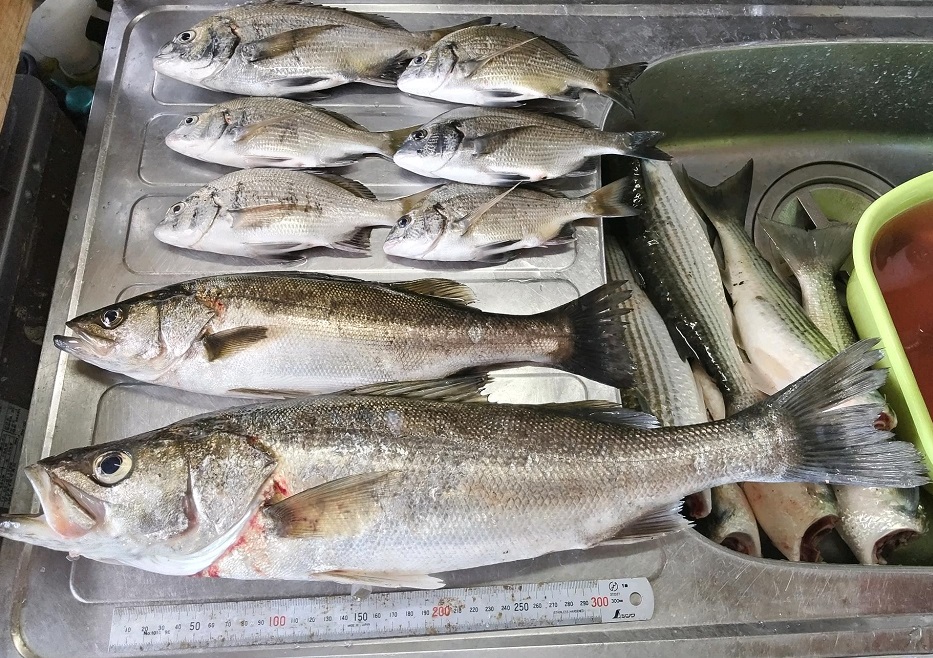 仕事終わりからそのまま走り1ヶ所目で投げるが無風で凄い湿度に気温29度か30度なので汗が止まりません。そんな中アタリが出てクロダイ小を釣るがそれっきりアタリが出ないので場所移動、次の場所は先行者ありで離れた場所に入るがアタリすら無く移動、次に入った場所でクロダイ小を追加するが先行者がどこも居てポイントに入れず しょうがないので以前朝方だけ魚が寄るところがあり その場所に行ってみる。まだ再現性があるのか 投げていると ロッドを押さえ込むアタリが出て アワセが早く入り過ぎて巻きに入ったところでバレる。魚は居るのでロッドを真上に立て 巻きを少し遅くしてみると 見事なアタリが出る!間を空けてアワセを入れるとナイスサイズのセイゴのエラ洗い!丁寧に寄せてネットに入れるがネットが小さいので魚が落ちる~ 2度落として 3度目で何とか押し込んで確保!55㌢のセイゴ大でした。クロダイ小を追加してチビセイゴに邪魔されつつ 夜明けと疲れでそろそろ止めようかと思っていた頃 イイ感じのアタリが出てセイゴ中が釣れラストにクロダイ小が釣れて一晩目は終了です。後半は雨でレインを着て釣りをしていてTシャツは汗でベタベタ….. かなり厳しい状況で何とかセイゴを2匹捕れたのは良く頑張ったと思います。