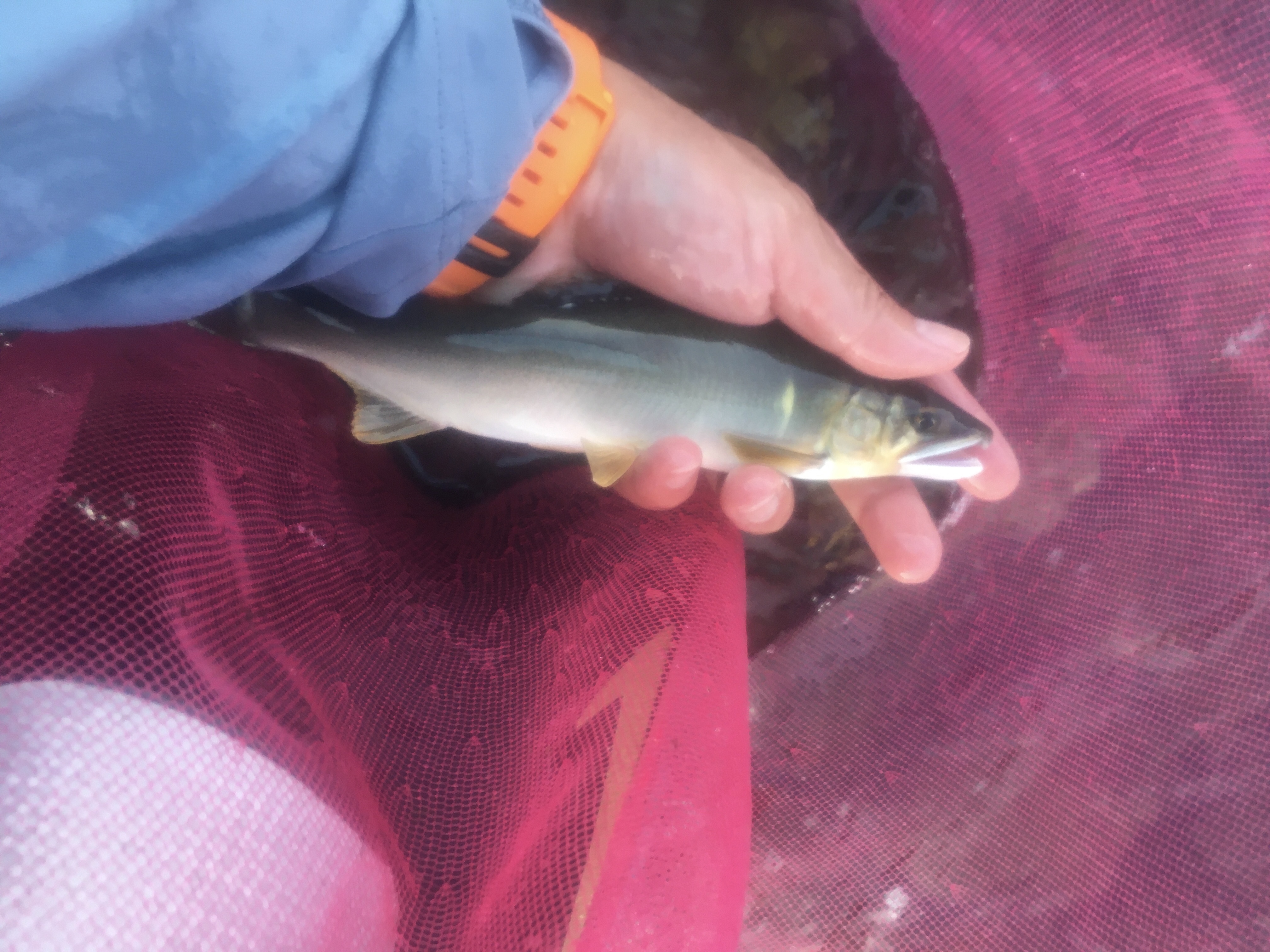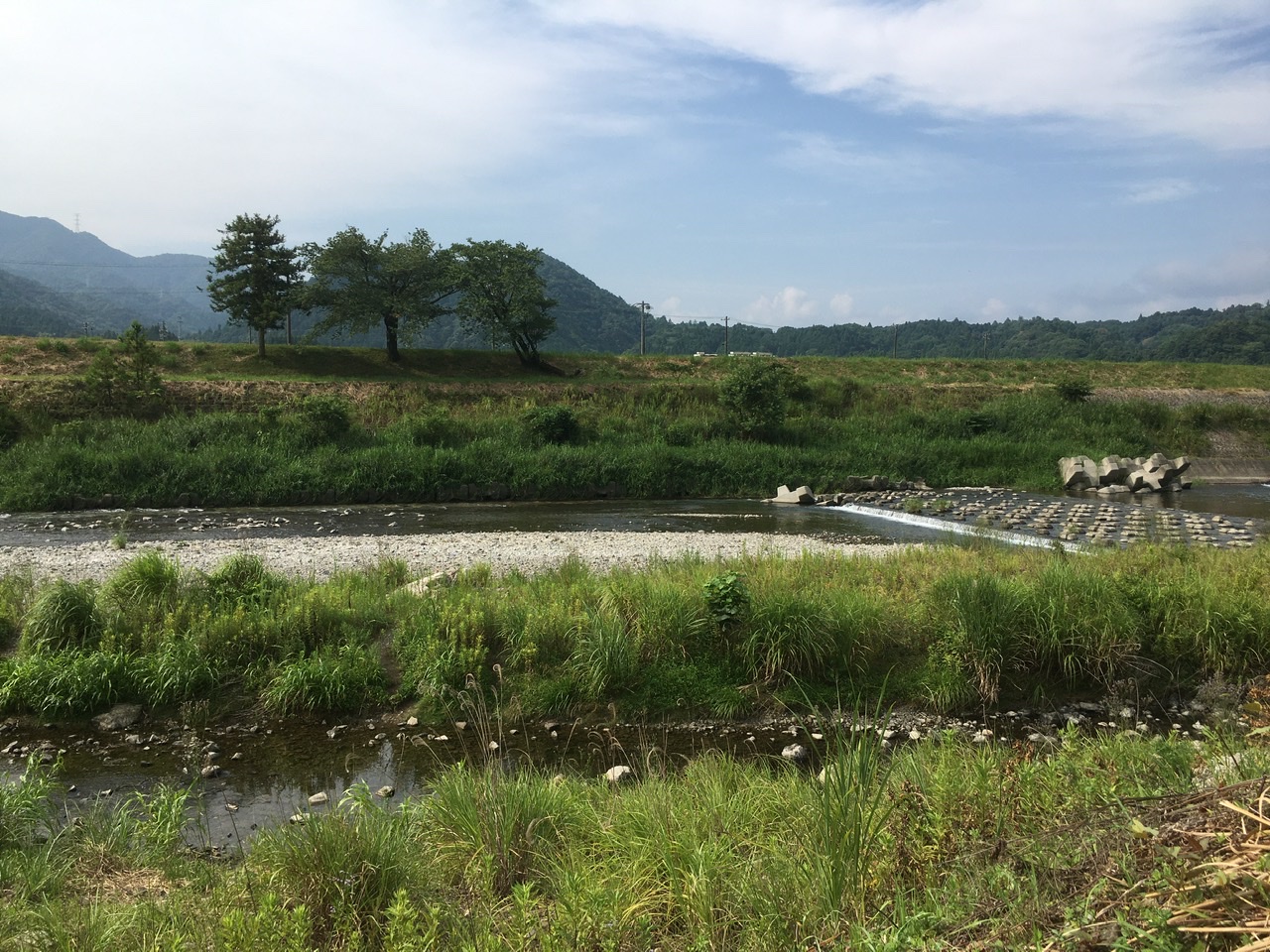 牧田川でアユイング!岩崎えん堤の下流に入りました。ダイワのアユイングミノー94SPレーサーインパクトに3本イカリを付けました。1番流れのある端の瀬を探りながら少しずつ下ります。流れが集中した筋にルアーが入った時に鮎が掛かり下流に流されます。大事に取り込むと22センチの良型でした。その後追われるのが見えるのですが掛からず、午前中は1匹。昼休憩を取り再開。すると午前中より、鮎のギラギラが見えます。15時くらいになると、いたるところでギラギラしてます。だんだん鮎の追気も出てきました。ルアーを94SFに変えてチャラ瀬で鮎がギラギラしてるところに見ながらルアーを泳がせると連発!ルアーを一気に上流に持ってくアタリもあり楽しい〜。最後はバラして終わりました。すぐにリールで巻くとバレやすいようです。
