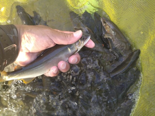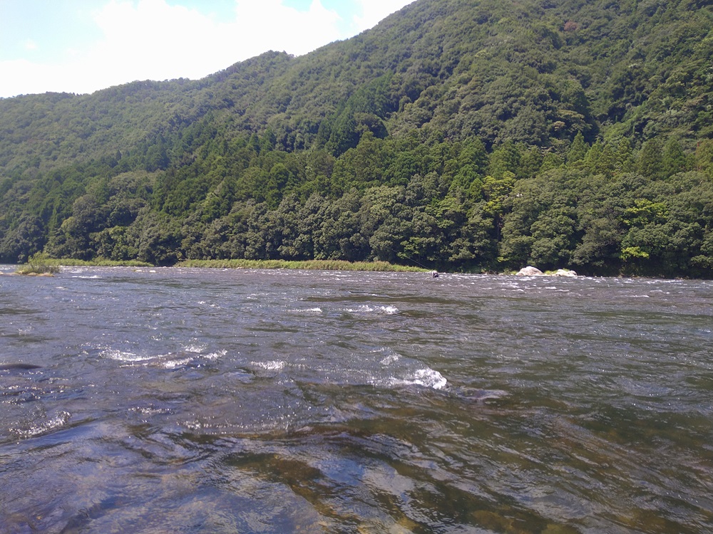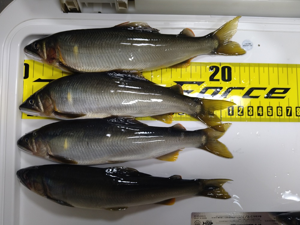 こんにちは~焼津街道店の三浦です。8月5日に福井県の九頭竜川に鮎釣りに行ってきました!当日入ったポイントは当店の新田チーフが7月下旬から何度も通っている坂東島の下流の釜淵です。朝8時にポイントに到着すると先行者2名のみ!早速準備して8時20分頃から釣り開始。先行者の方は右岸と左岸上流で竿を出していた為、私は左岸の下流に入りました。釣り下っていくと20㎝前後がポツポツ掛かります。左岸の一番きつい流れを探ると23㎝が背掛かり!その後も掛かるも竿のパワー不足?で魚が浮いてこない・・・このままでは厳しいと思い、車に戻り荒瀬竿にチェンジし同じ流れを探りますが、鮎のサイズが20㎝前後でオーバーパワーで引きを楽しめない。昼までに17匹。移動するか迷いましたが、午後も同じ場所で釣りをすることに。午後からは上流側から釣ってみるとサイズも大きいが連発はなし。ポツポツ掛かり17時までに21匹追加し38匹の釣果でした。サイズは15㎝~23㎝まで平均サイズは18㎝くらいでした。今年の九頭竜川は鮎が多すぎてこの時期にしては鮎が全体的に小さいです。盆明けくらいには20㎝前後の数釣りが楽しめると思います。