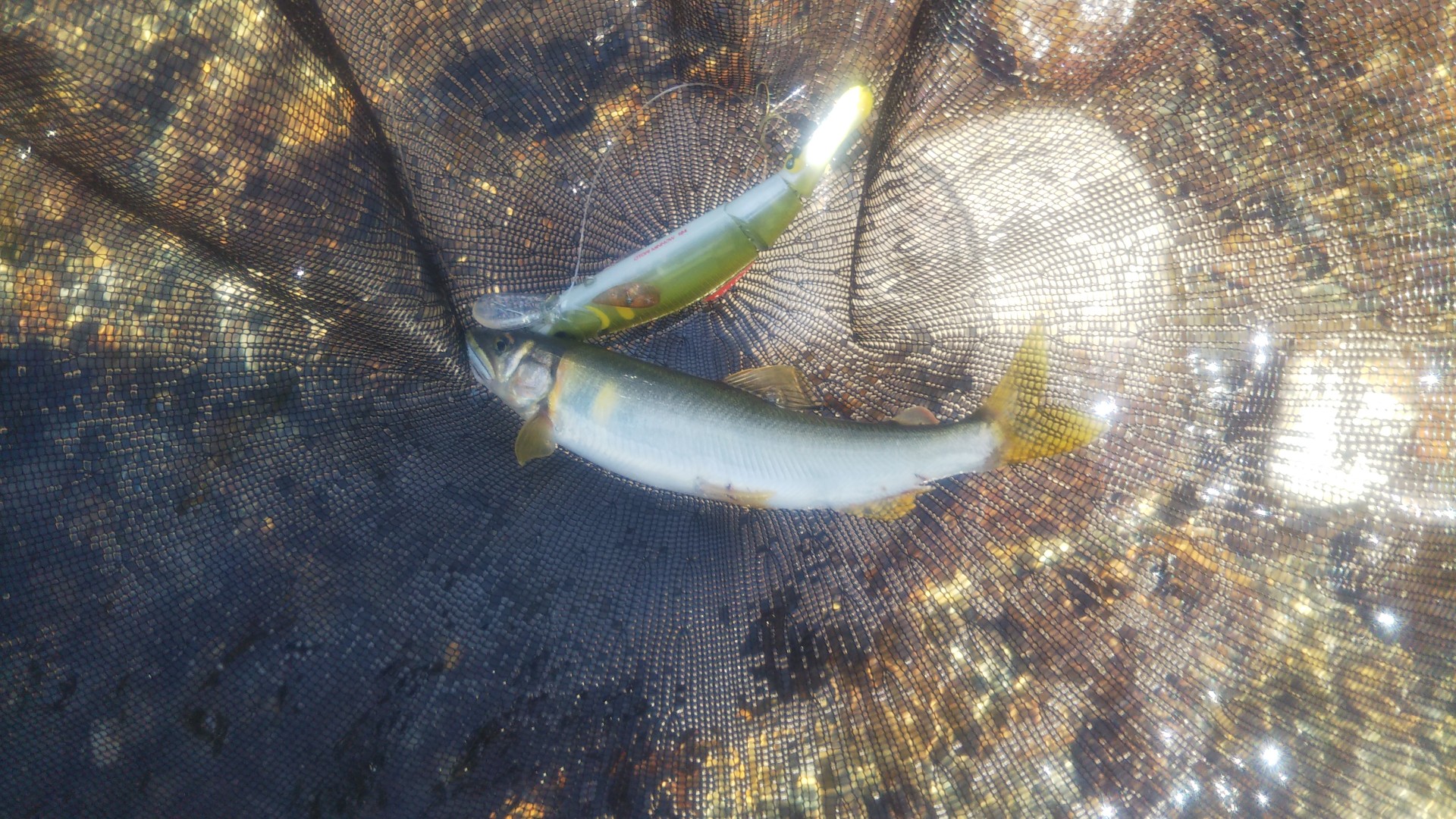 滋賀県の愛知川でアユイングに行ってきました。渋川の漁協事務所で遊漁券購入(自販機がありますので便利)。渋川で先行者がいらっしゃったので、本流の予定していたポイントへ行くも草多く入川困難で諦め、紅葉橋の下流へ。臨時駐車場と階段もありエントリーしやすいです(神社?横)。開始、10分くらいで1匹GET15㎝ほど。その後1時間ほどでルアーより小さい鮎2匹追加。これはポイント選定を誤ったか。