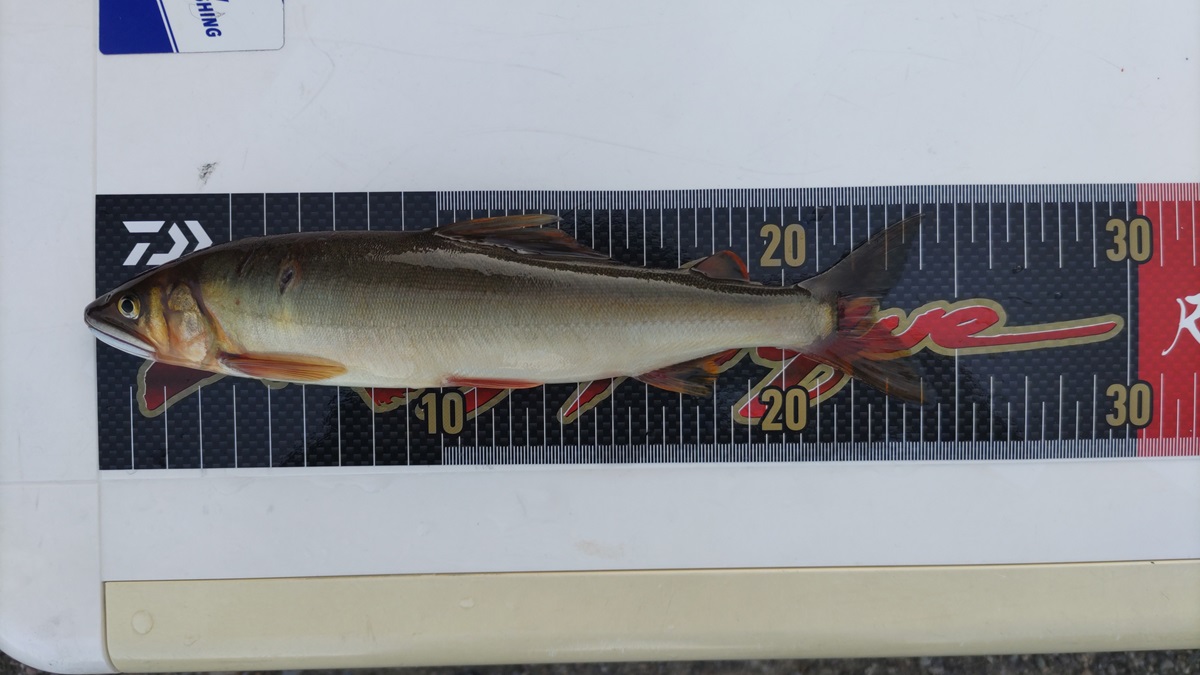 これはデカいと感じながらロッドを寝かせながら寄せてきます。ロッドから伝わる重量感はデカいのは確実です。丁寧に寄せて抜き上げますが重い!低い弾道で抜き上げ見事にタモ入れ成功♪上がってきたのは24センチの立派な鮎でした。もうこれだけで満足しますが、続けて20センチオーバーがヒットします。午前中で十分に楽しみましたが午後3時過ぎからも鮎が掛かり出しトータル13尾の結果となりました。