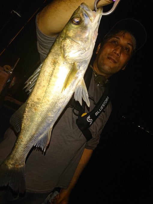 こちらは潮と風がなかなか止まらず大苦戦でした。その後、船長の読みどおりにシボイルが出始め、何とかシーバスを一尾釣らせてもらいました。