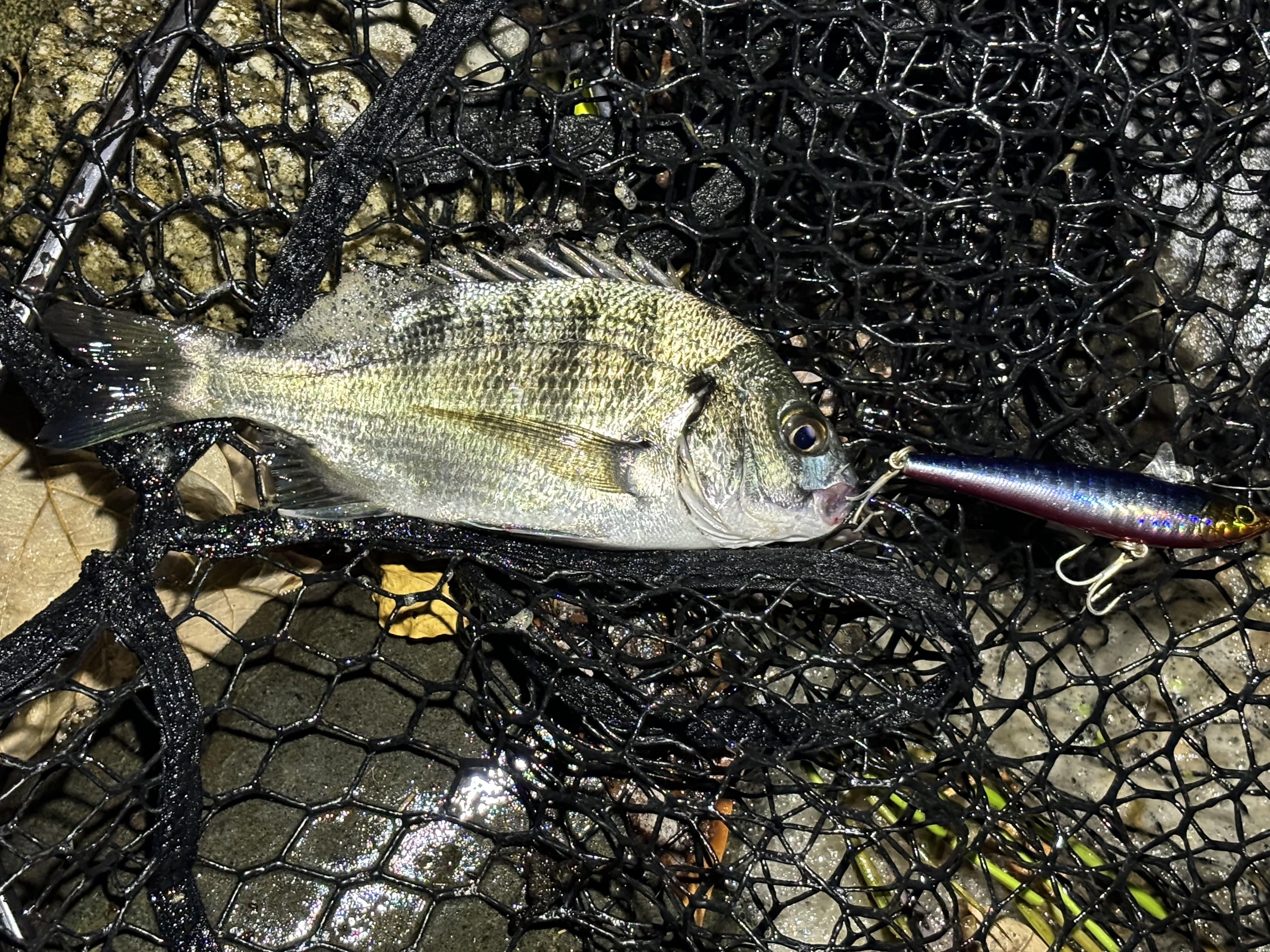 1時間程経ったタイミングでプチ時合。サイレントアサシン80Sで小型をバラシ。ローリングベイト77SSSに変えてゆっくり巻いてくると再びヒット!たい焼きサイズのチヌ。続いて40㎝弱のキビレがヒット。