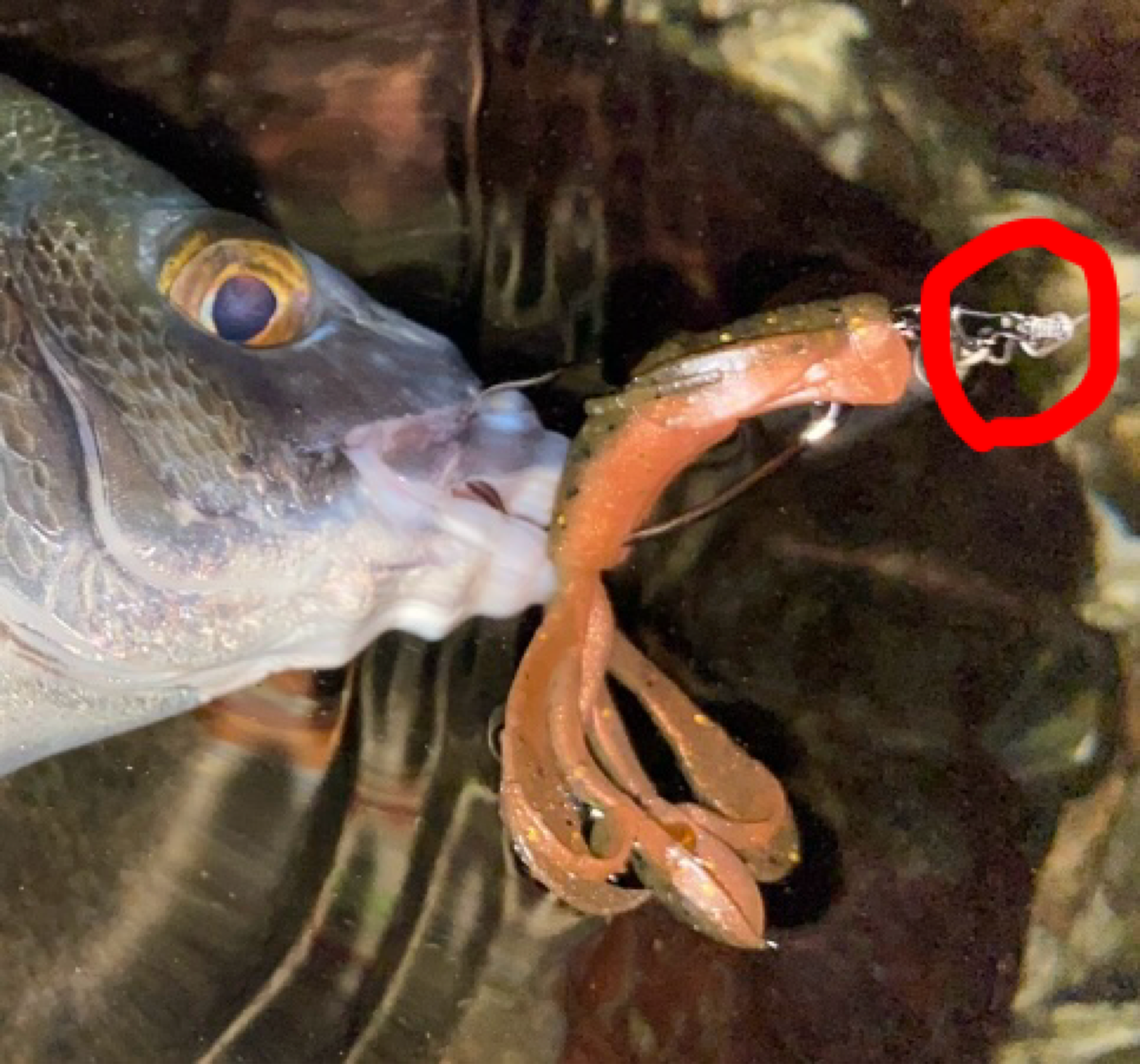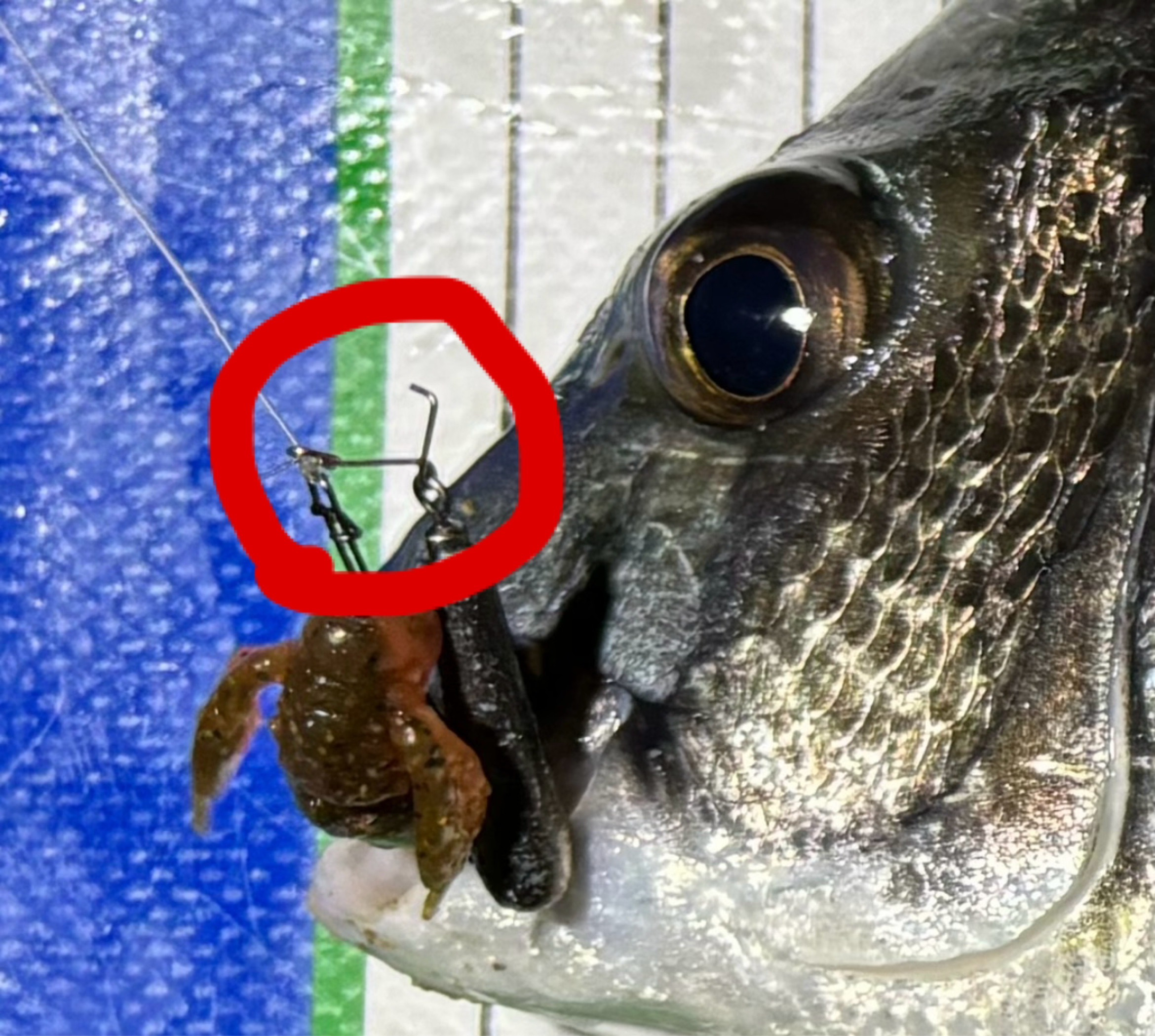 そんなわけでワームに変更。クレイジーフラッパー2.4インチ、シンカー5gでボトムを引いてくると反応あり!何回か乗らないアタリがありましたが同じコースを通していくとようやくヒット。カラーはグリパンオレンジゴールド。浜名湖ではラメ入りのカラーがよく効きます。