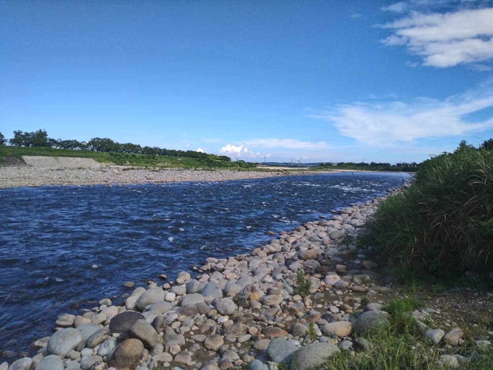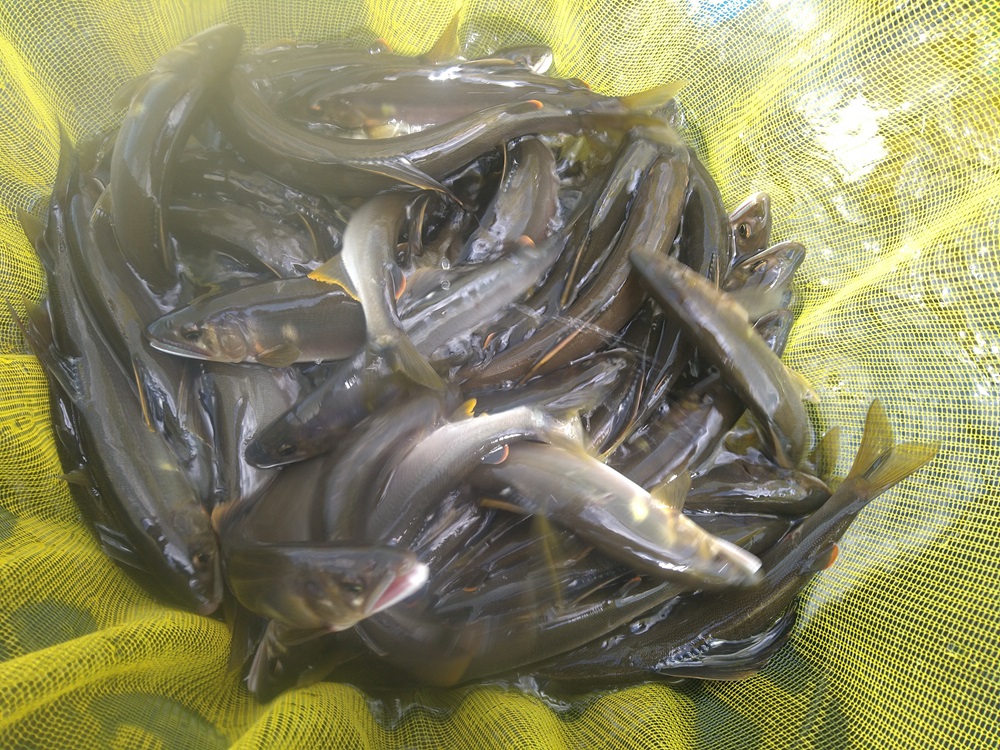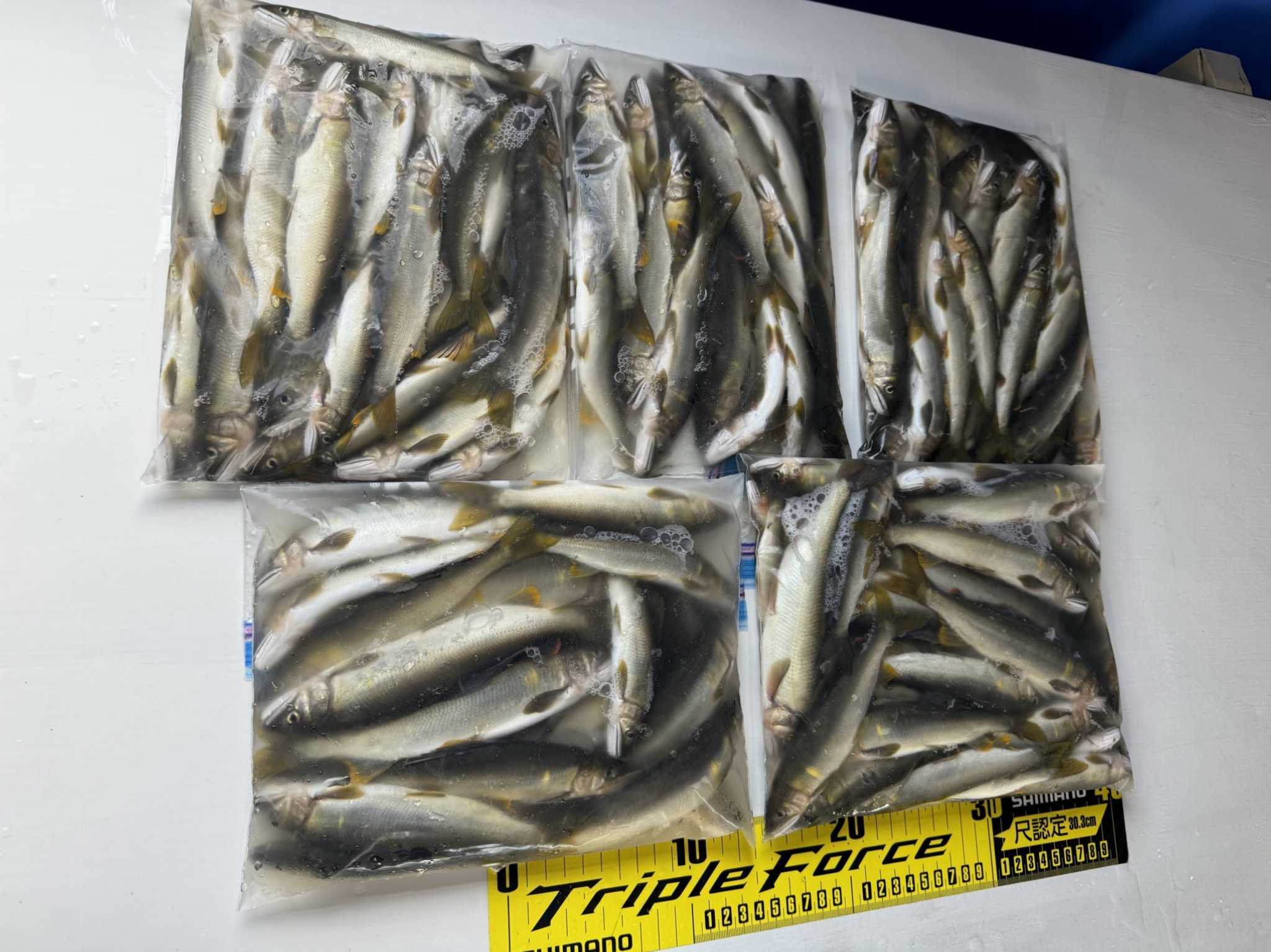 こんにちは~焼津街道店の三浦です。絶好調の富山県神通川に鮎釣りに行ってきました。当日は朝3:30分に出発し、オトリ屋さんには8時15分頃に到着。遊漁券とオトリを購入し、9時頃から新婦橋下流へ入川。右岸から釣り下っていくとすぐに掛かるも14㎝くらいの小さい鮎。ポツポツ掛かるもサイズは小さい。そのまま釣り下っていくと瀬落ちに近づくにつれてサイズアップ。川の真ん中にたって左岸を釣るとよいペースで掛かります。ペースが落ちてきたので、今度は左岸側から釣り上がり午前中3時間で67匹。昼食後も同じポイントで17時まで楽しみ65匹追加し、132匹の釣果でした。一日同じポイントで釣りをしましたが、右岸と流心は全体的にサイズが小さい。左岸や深瀬みたいなところが比較的サイズがよかったです。鮎のサイズは10㎝くらいが数匹交じりましたが、ほとんどがオトリになるサイズで、背掛かりで黄色い鮎が掛かるので非常に楽しい一日でした。※タモの釣果写真は午前中の釣果のみの写真です。手で持っている写真の鮎が釣れる鮎の平均サイズです。
