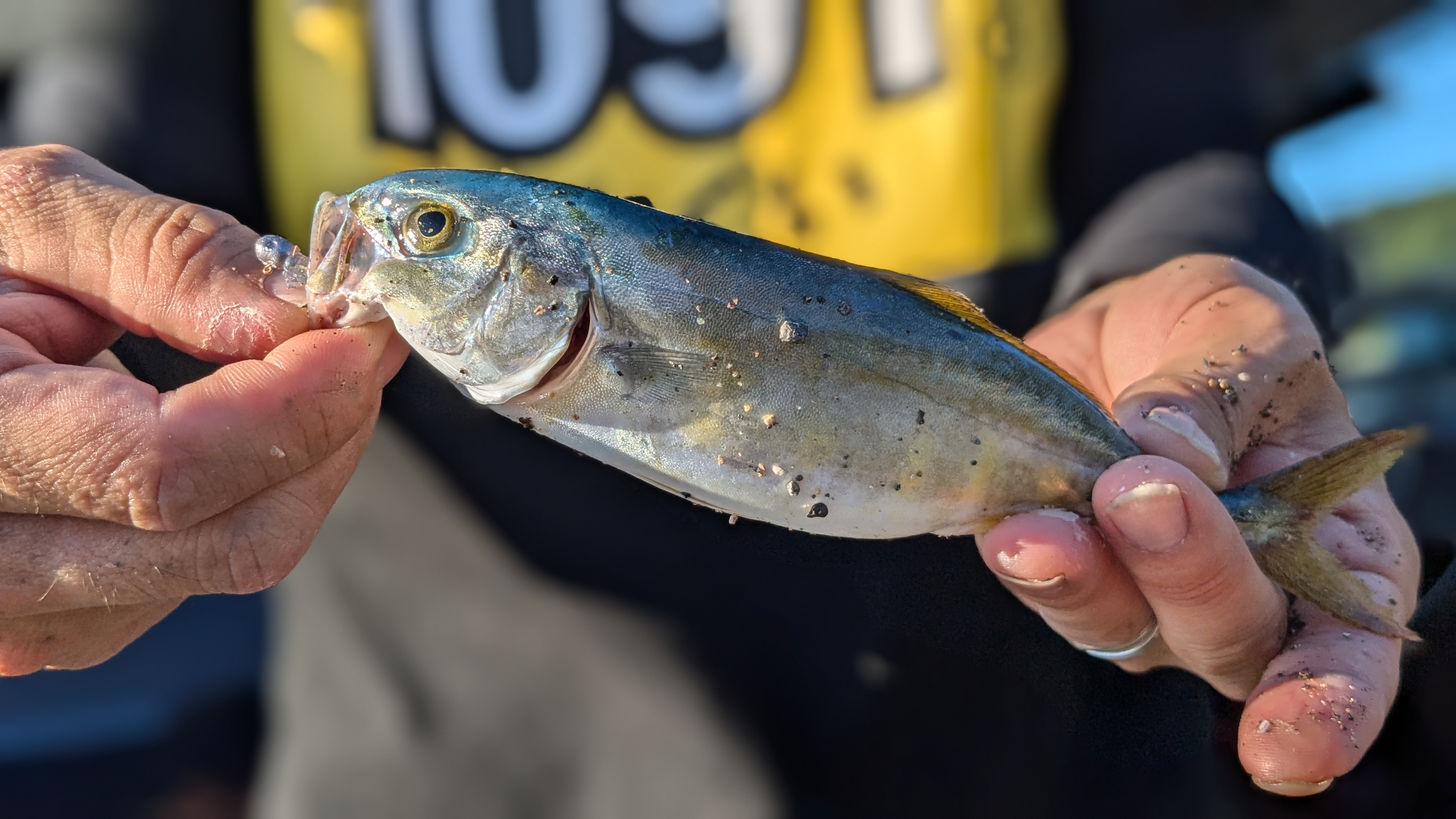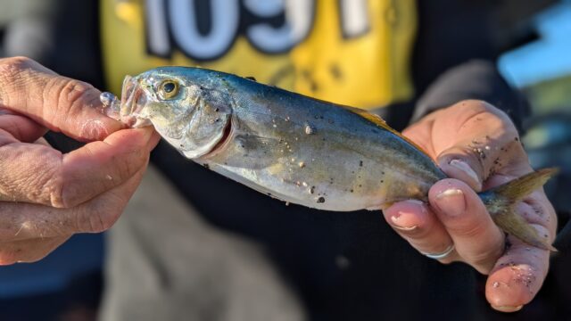 めちゃくちゃ引くので、丁寧にやり取りをするとな、なんとブリの幼魚(ワカシ)がお出迎えしてくれました👍