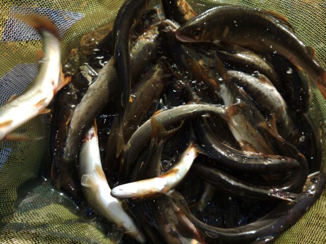 しかし、既に先行者が瀬肩のポイントで竿を出していたので仕方がないのでさらにその上の瀬肩で釣り開始。すると1分もしないで1匹目が掛かりましたが10㎝ぐらいの安曇川サイズ・・・。 それをおとりにするとすぐに入れ掛かり!しかし、同じサイズばかり・・・。 瀬の前後を釣り歩き午前中の釣果は10~15㎝を35匹の釣果でした。