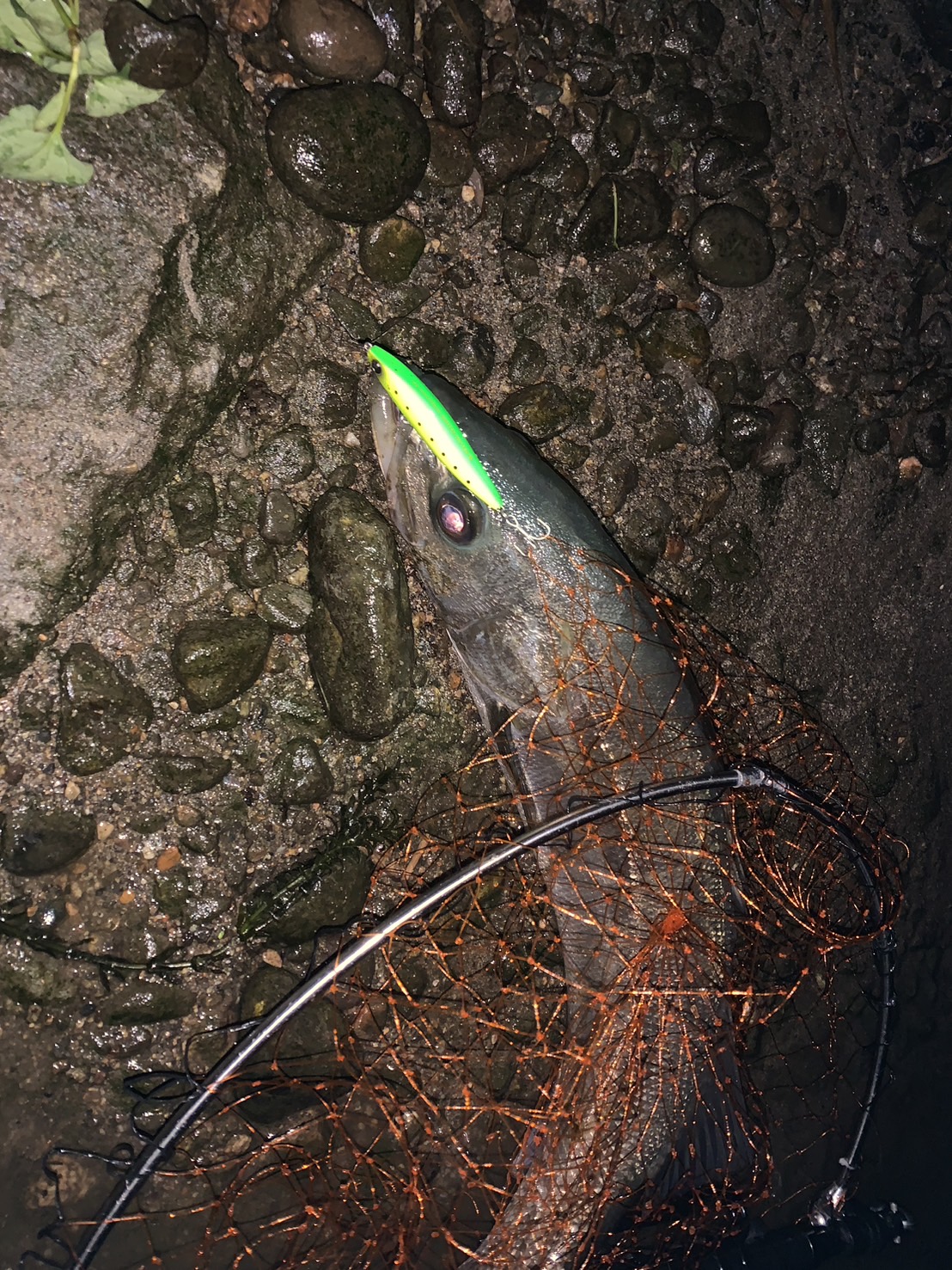 富山遠征2日目は夕マズメから昨日と同じポイントに。日が落ちてすぐに昨日坊主だった友人にヒット!