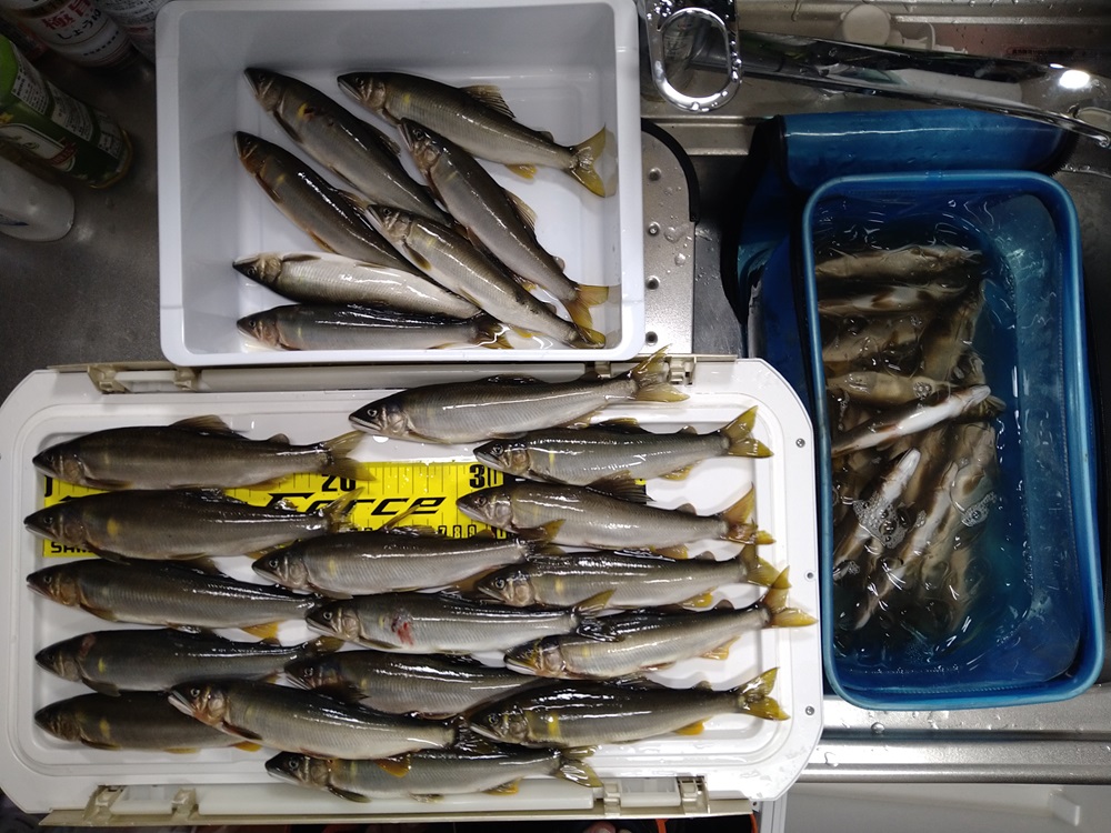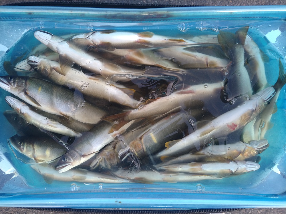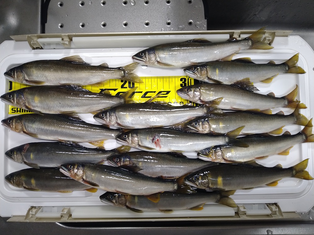こんにちは~焼津街道店の三浦です。9月5日に九頭竜川の中部へ鮎釣りに行ってきました。当日は朝3時30分頃に出発し、7時頃にはオトリやさんに到着。9月4日に北島や吉波に入川したお客様から30匹前後で数も伸びず、サイズも小さいと連絡があった為、9月4日に当店の新田チーフが入川してサイズがよかった釜淵へ。7時30分頃から釣り開始。朝はかなり濁っており石が見えず風も吹いていた為、釣りにくい状況。まずは左岸を釣り下ります。いいペースで掛かり、11時には引舟がいっぱいになった為、車に戻りオトリ缶へ11時までの釣果32匹を移し早めの昼食。人も増えて動きにくくなった為、昼食後は午前中に竿を出していない左岸の上流側を釣り2時間程で15匹。14時頃には人も少なくなってきた為、朝一反応のよかった左岸をもう一度釣り下り1時間で9匹。途中で転んでタモを折ってしまった為、車に戻り予備のタモで17時頃まで楽しみ14匹追加し70匹の釣果でした。サイズは14㎝~24㎝まで、70匹のうち21㎝以上が24匹、19~21㎝までが34匹、19㎝以下が12匹でした。鮎も若くまだまだ楽しめそうですよ!