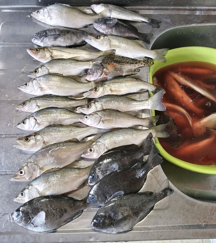 素晴らしく昔に浜名湖へ行ったっきりご無沙汰しておりまして今回は釣り場開拓に向かいます。名古屋北店から2時間あれば釣り場に居ますので北陸の敦賀より20kmほど近いですね、ポイントに着くと先行者3名遠くには何名も居るのでアクセスの良さで皆さん釣りに来られるみたいです。ポイントらしき場所で投げていると何か触るので丁寧に食わせると掛かった!上がって来たのは木っ端グレで次もグレ、3匹目にやっとセイゴが釣れて次もグレとナイターなのにグレが普通に食って来ます。そして浜名湖名物の下げ潮が効き出し流れが早くなる、しかしこの方がセイゴを食わせ易くしてくれてセイゴをポツリポツリと釣っているがイマイチなので場所を動きながら探ると居ました!浅い場所に投げると毎回アタリがありセイゴとグレが釣れて来ます。始めはサイズが小さいので逃がしていましたが後半で必要分をキープしながら釣りド干潮で底が見えるぐらいになったので朝3時半終了です。昼間も調査しようと思っていましたが夜でも暑すぎて無理せず今回は早目で切り上げます。