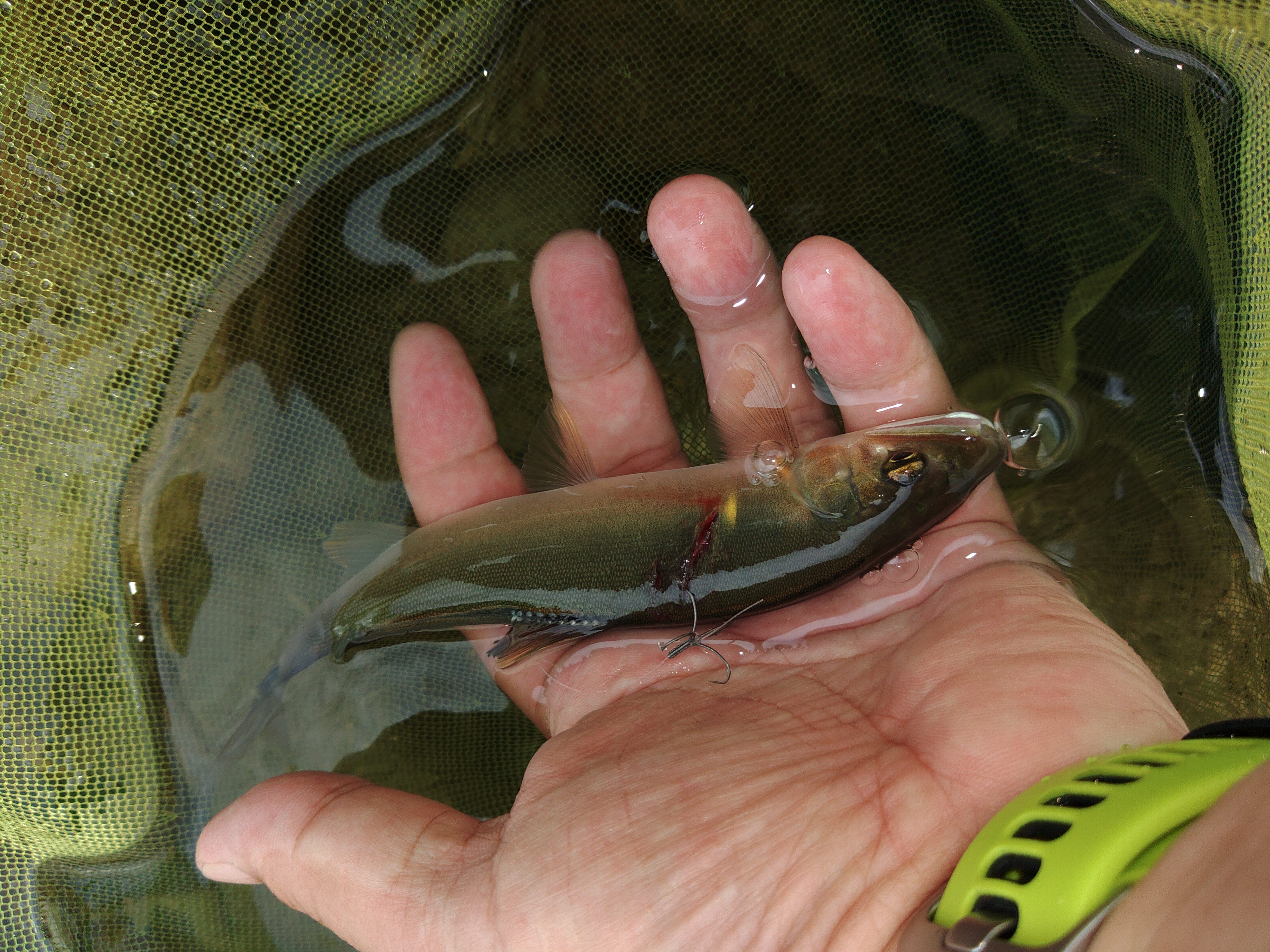 AM7:00に竿を出すとあちらこちらで鮎が跳ねている。 するとすぐに15㎝クラスの鮎が掛かり4連チャンで入れ掛かり! しかし、掛かりが悪くなってきたので瀬に突入。 ポツポツと掛かるもののバラシやキャッチミスでなかなか数が伸びず、おまけにサイズも12~15㎝前後で今一つ・・・。