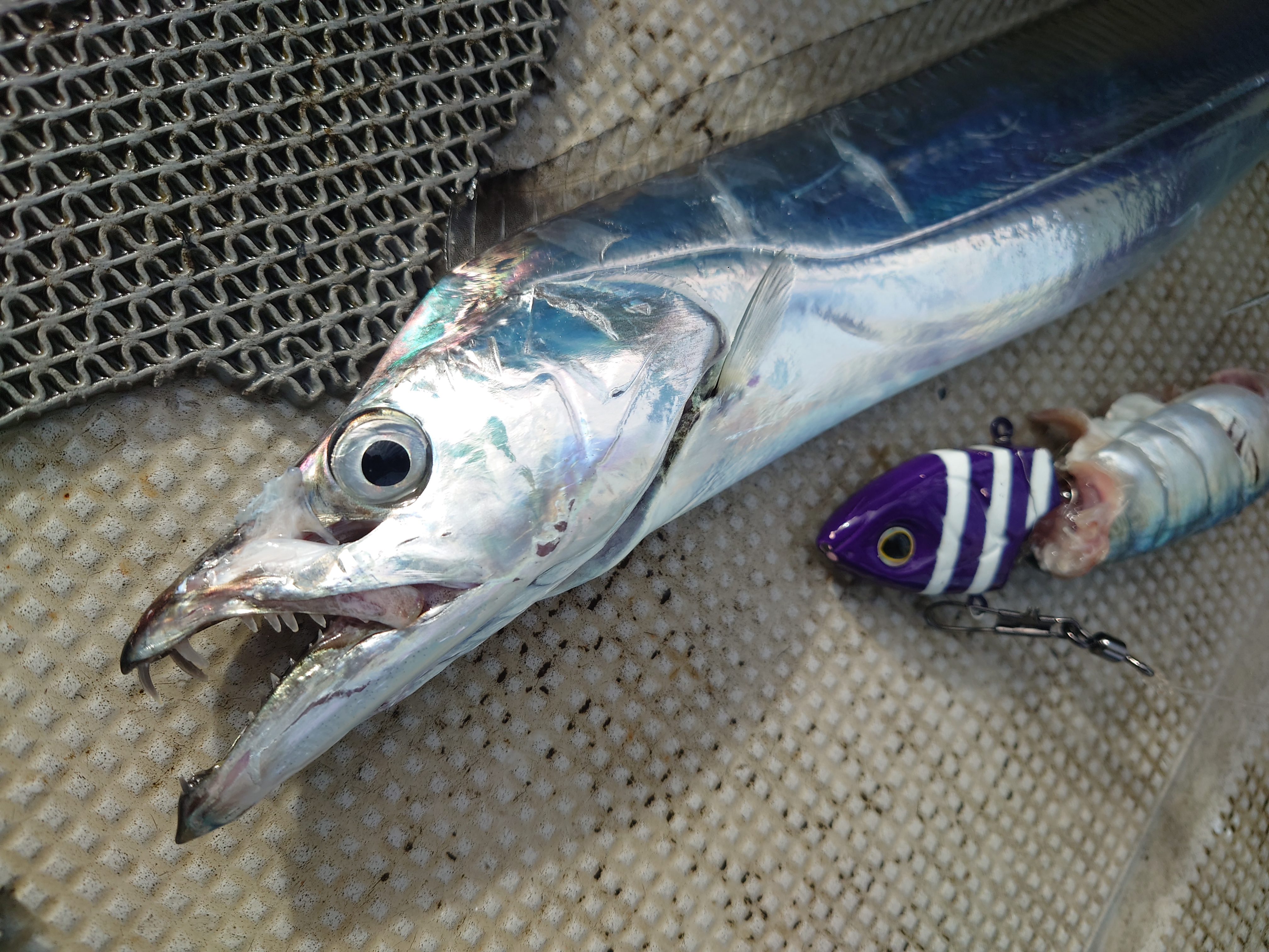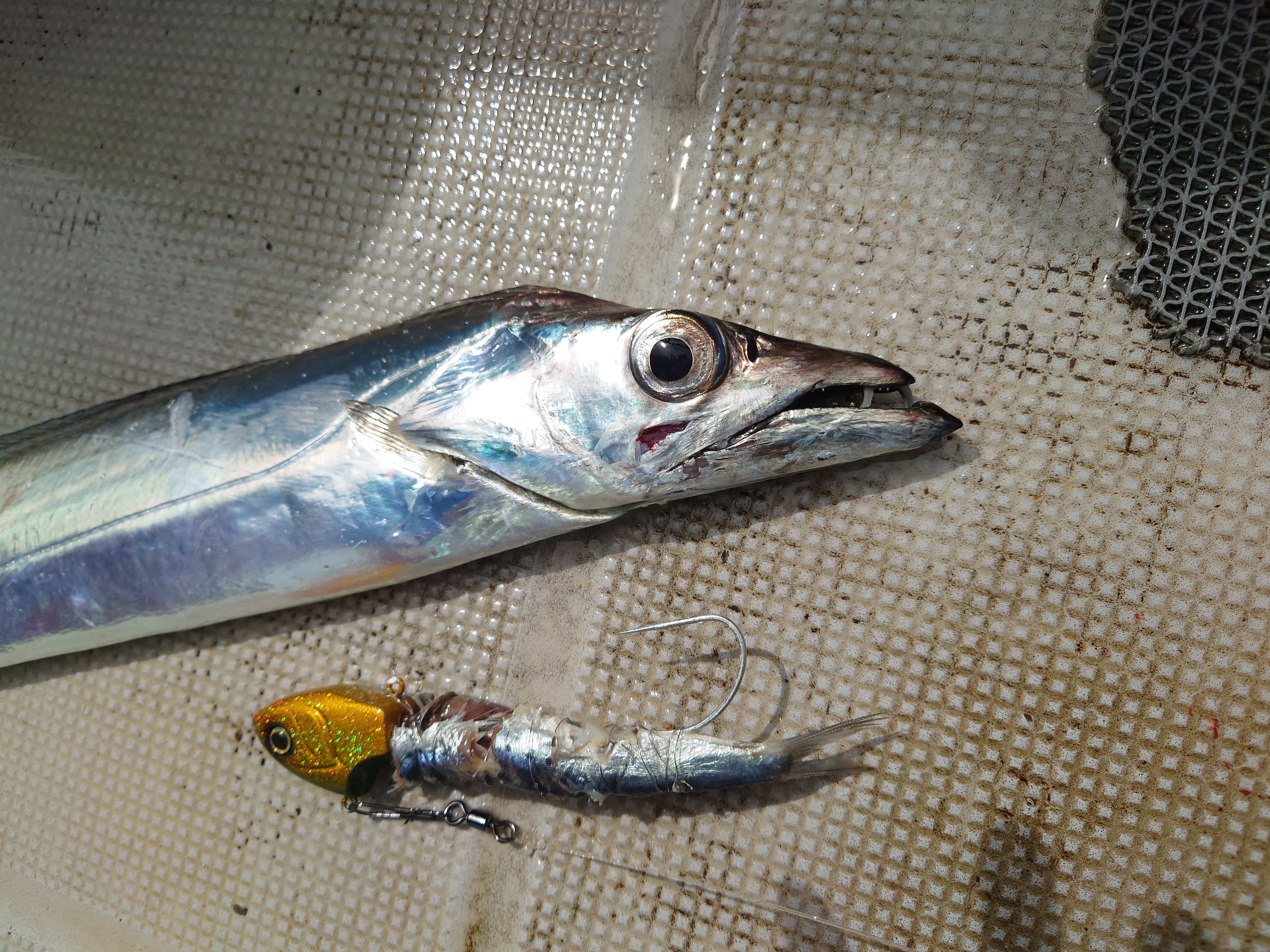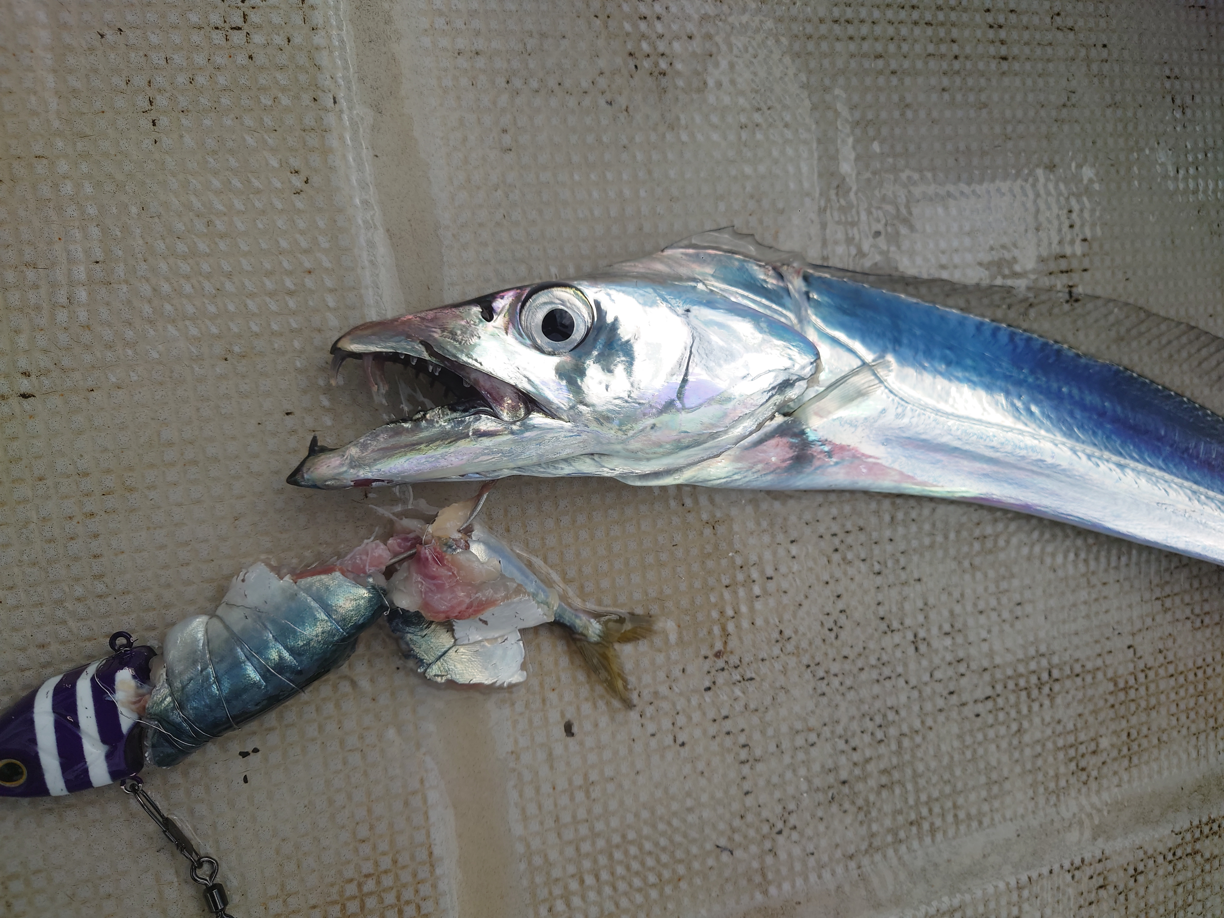 鳥羽KAIEIMARUさんで太刀魚テンヤに釣行。少し波風強いですがいい感につれていますよ。水深70~90m前後でテンヤはシマノ50号使用、このテンヤはヘッドの形状がエサとフィットしやすくてお気に入りです。エサはイワシ、アジの丸干し、サバと用意して比べてみます。開始早々から入れがかり状態、F3~3.5が多い中でF4が時々という感じでした。途中あきらかに少し小型が静かになり、大型の気配か?予想通り?隣の方がF7~8クラスを連発、私ににも2回きましたがあと少しのとこで針外れで終わりました残念。それ以外はF5クラスは3本とまずまずのサイズが釣れました。エサはイワシが一番食いが良かったですが、サバも小型が多い中で大型狙いには有効か?アジの丸干しはエサ持ちが抜群にいいので数釣りには最高です。現在も数型ともに絶好調の太刀魚テンヤです。