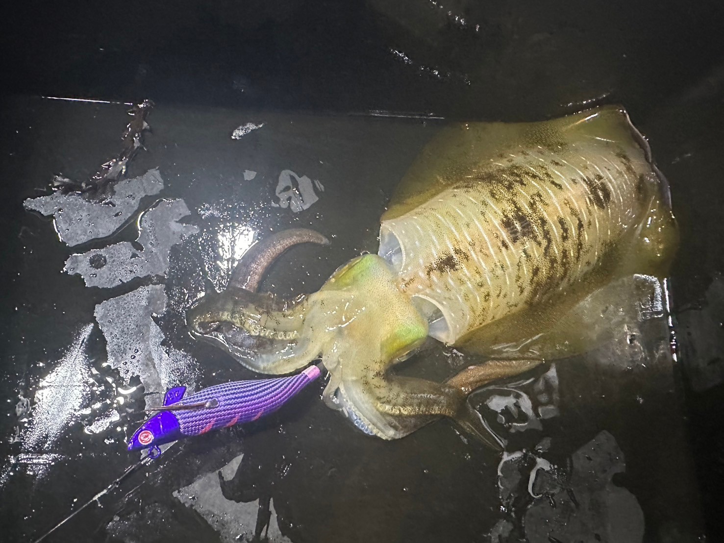 ベイトがまだまだ小さいため、エギはティップランナーの2.5号を使いました!朝一 パープル→ゴールド→グリーン、ブラック系のローテーションで爆釣!また、ラトル入りのティプランナー響にも好反応でした!