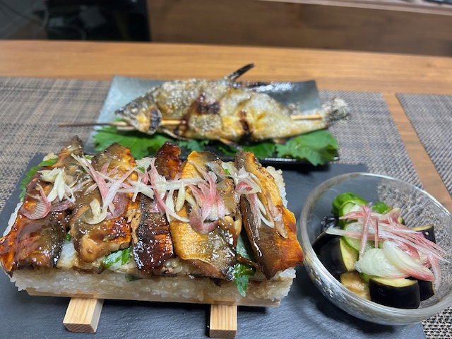 この押し寿司が美味い!鱗を取った鮎を三枚おろしにして、生姜のスライスと一緒に甘露煮風に煮詰めるだけ。あとは押し寿司器に酢飯を薄めに敷き、その上に大葉、その上に鮎、その上に再度薄めに酢飯、大葉。ここでグッと押し、1番上に鮎を乗せて出来上がり。お好みでミョウガなど散らすと夏感が増して美味しいです。お試し下さい。