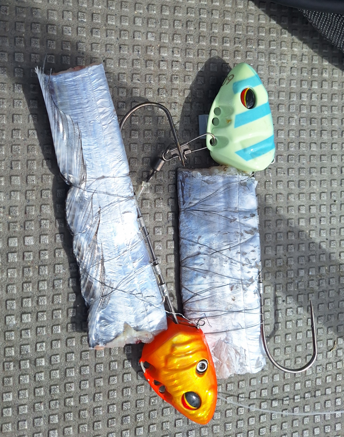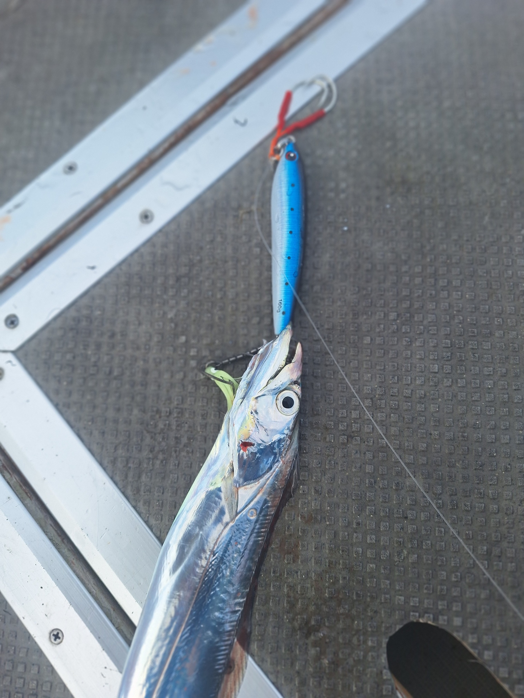 実は2日前にも鳥羽沖でジギングで太刀魚は釣っていたので余裕でいたのですが、本日は太刀魚の機嫌が悪くなかなか口を使ってくれませんでした。皆はテンヤにイワシを巻き付けてアタリが有るようでしたがシッポだけ噛られる程度。。自分は「余裕で釣れるわ」と思い、今回イワシは買って来ませんでした。自分はジギングでスタートして釣れた太刀魚カットし、テンヤで釣る作戦。2日前にはアタリが連発したのですがおさわりもなく、最後の手段のタコベイトをセットし落とすと、やっとアタリ。初めは良く引きましたが上がって来ると軽くなり指3本クラスでした。早速、ハサミで太刀魚カットして、テンヤにセットし落とすとアタリが連発。イワシより餌持ちが良く2匹位は余裕で釣れる位でした。一番良い型で自分は指4本でした。魚はそんなに要らないので小さいものは餌にして良い型の魚呑みクーラーに入れて結局、4本キープで1時に納竿となりました。小さい太刀魚は要らないと言う方は是非お試し下さい。