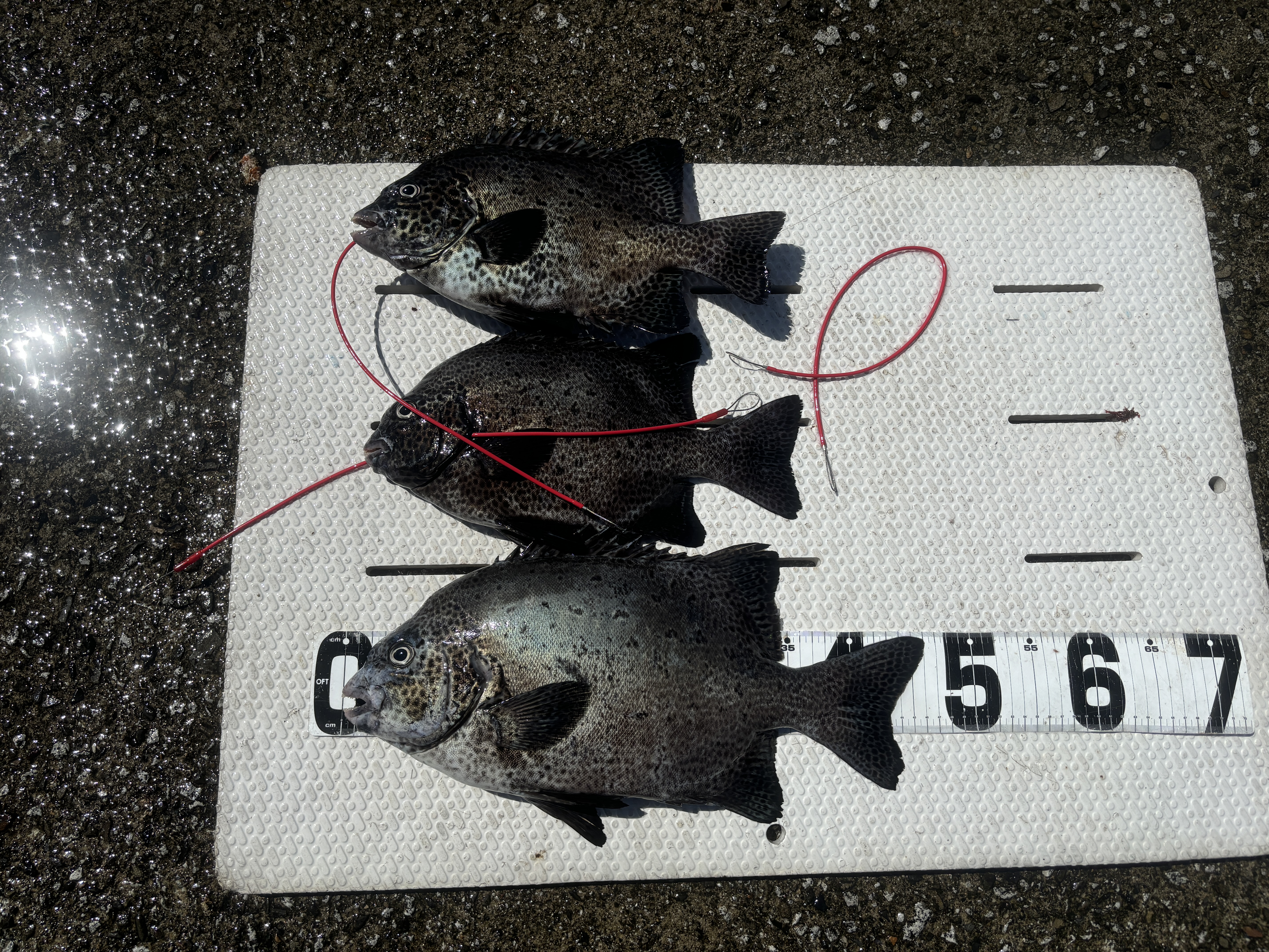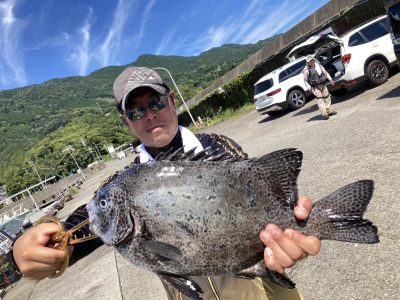 大ちゃん渡船様で底物を狙いに行ってきました!AM5時出船!渡礁したのは足場の良いチャビン。ホント平らでまるで堤防のような場所!釣り座は桃頭島向きに構えます。餌はガンガゼオンリー。仕掛けは瀬ズレワイヤー1ヒロに遠投テンビン、オモリ30号を使用。ワイヤーハリスに針は15号で挑みました。釣開始から1時間程はジャミ(エサ取り俗称)のアタリしか出ませんでしたが打ち返していると重いアタリに変わりました。十分に舞い込んでから合わせると確かな引き!グイグイ引きます。上がってきたのは良型のイシガキでした。その後もアタリがあり2枚追加しました。しかし暑すぎて軽く熱中症になりダウン。水分補給はしっかりしていましたが日差しが強すぎました。この時期の磯はパラソル必須ですね。涼しくなったらまた行きます。