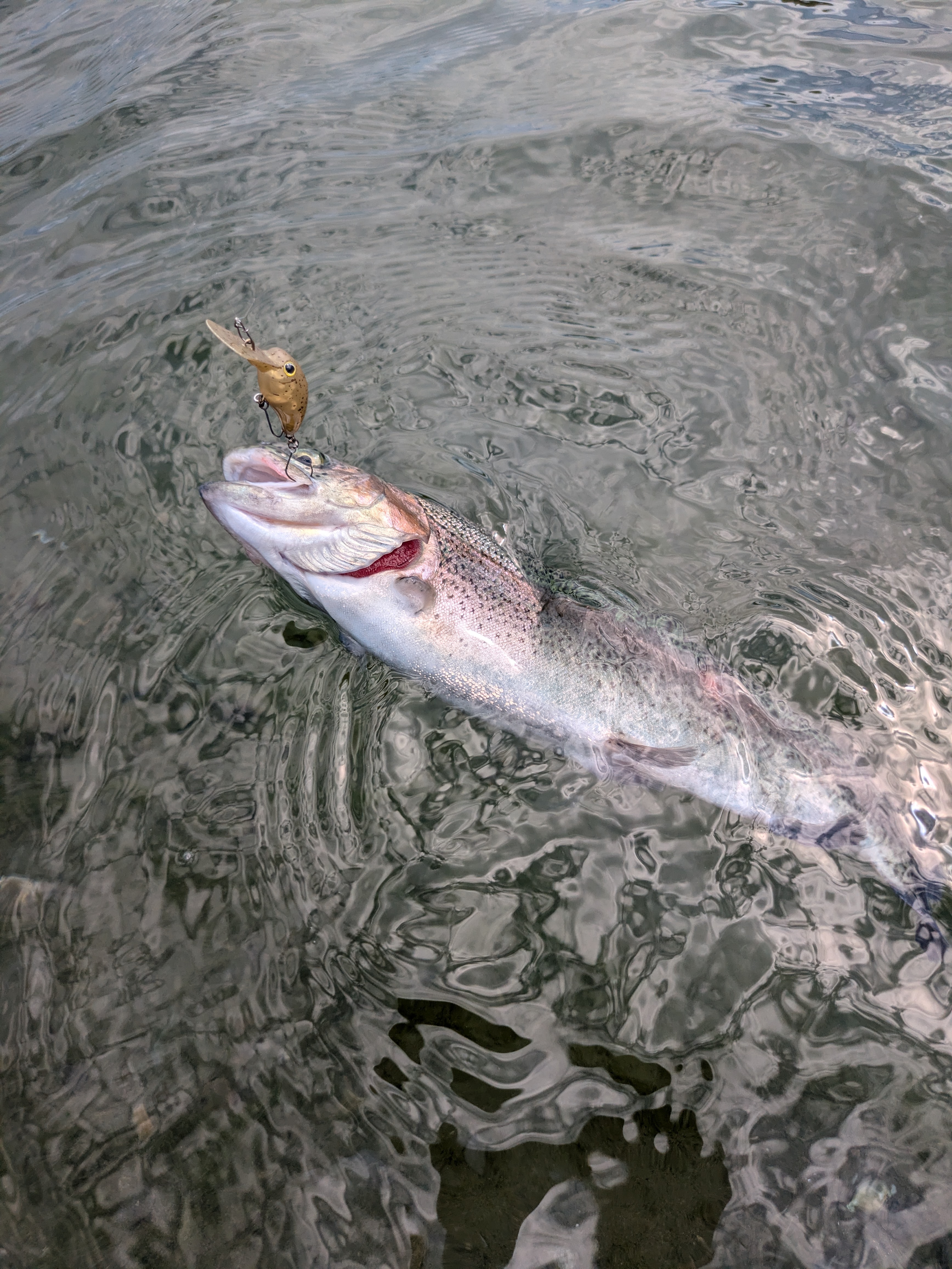 スプーンでかからなくなってきたのでクランクへ。スプーンの反応をヒントにボトムノックしていくと連発!パニクラMRとDR、渋くなったらキビパニでローテ、しばらくするとあたりが戻るので繰り返しました。午後になり浮き出したのでウィーパーの0.9と0.6gで表層引き、風が強いときはワウで!表層からボトムまで順繰りにさぐっていきました。