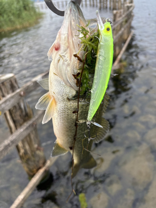 風が少し吹き始めたタイミングでバイト!30cm位のバスでしたが、トップで釣れて気持ちよかったです!