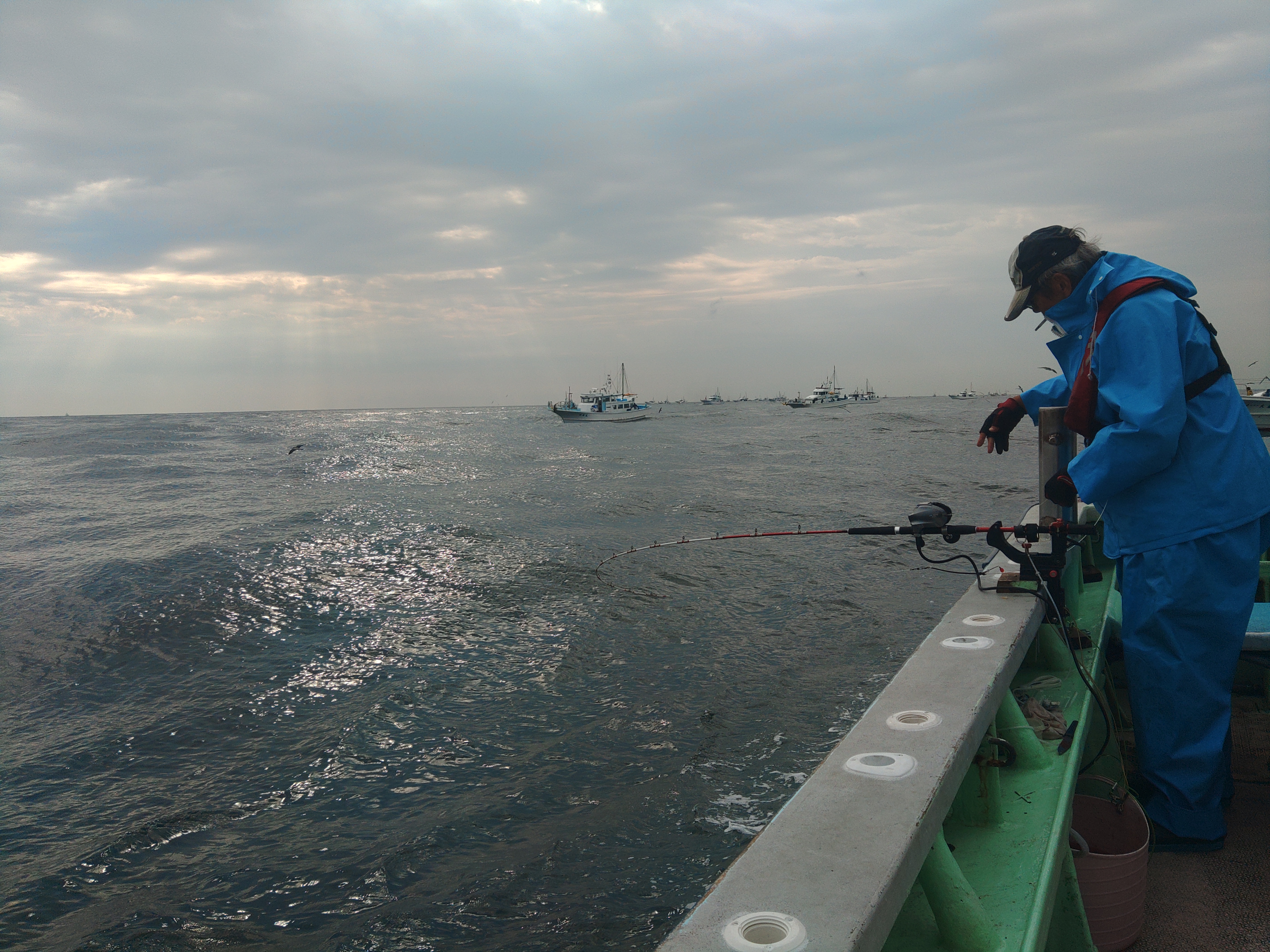 朝から雨が降るあいにくの天気でしたがAM6:00の出船時には雨も止み曇りで絶好のタチウオ日和になりました。