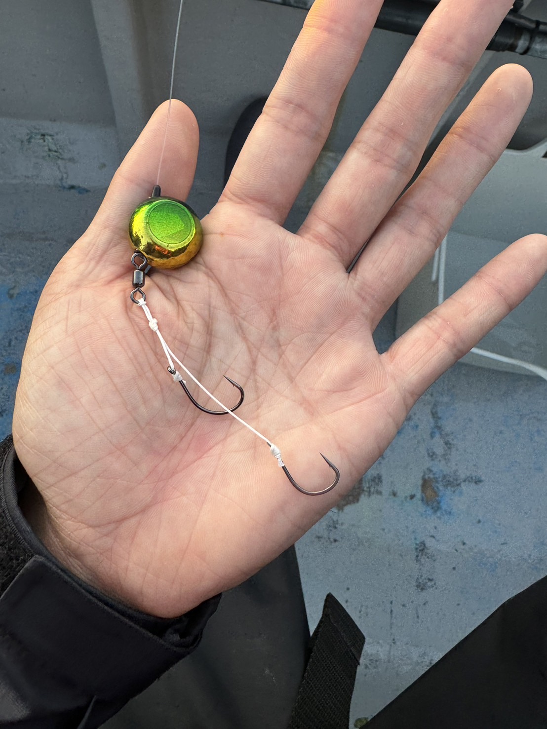 仕掛けはタイラバベッドに適当なフックを2つ結びつけただけの仕掛け、針に糸が結べる方なら船の上でも簡単に作れる仕掛けです。自分は初めてだったので、エビの大きさにあったちょうどいい仕掛けを船上で微調整しながら釣りをしてました。