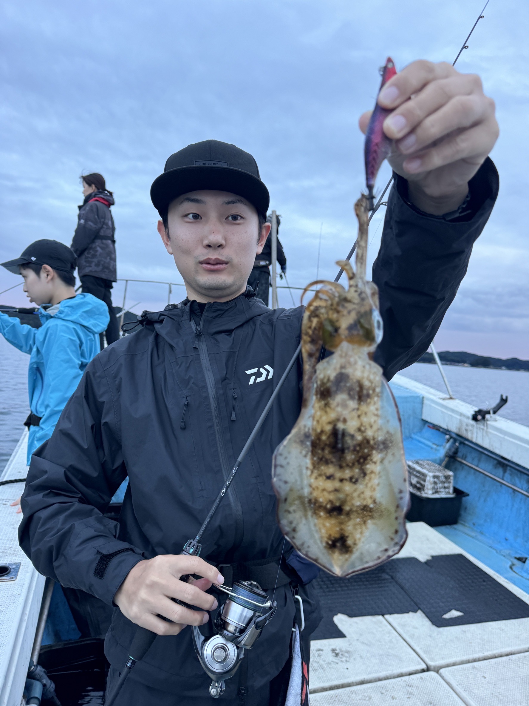 朝イチの地合いが終わり、沖のポイントに移動しました。水深は、20m〜40m。同船者は、ポツポツとキロ近いアオリイカをヒットさせるも、自分にはアタリがなく終了となりました。