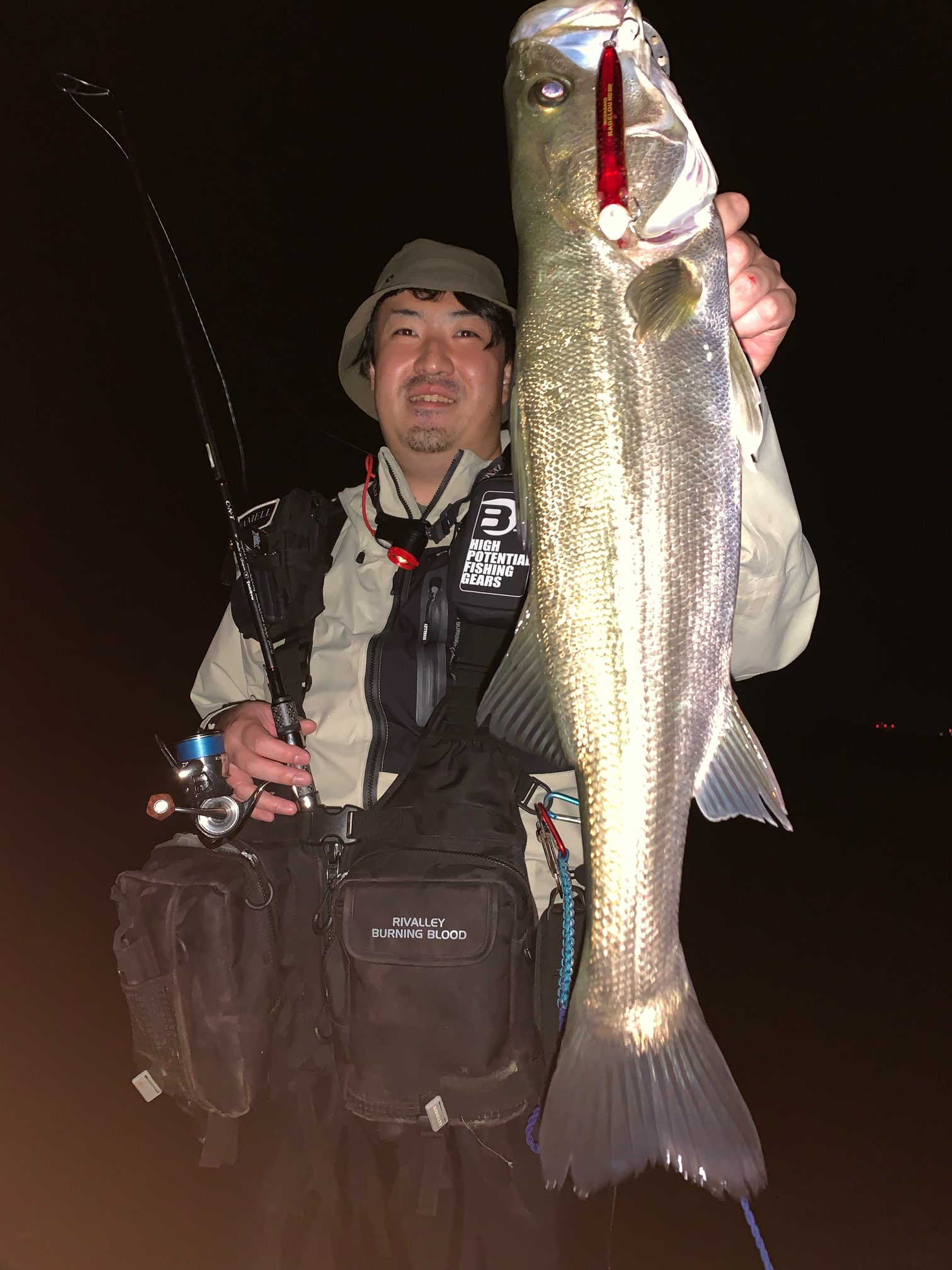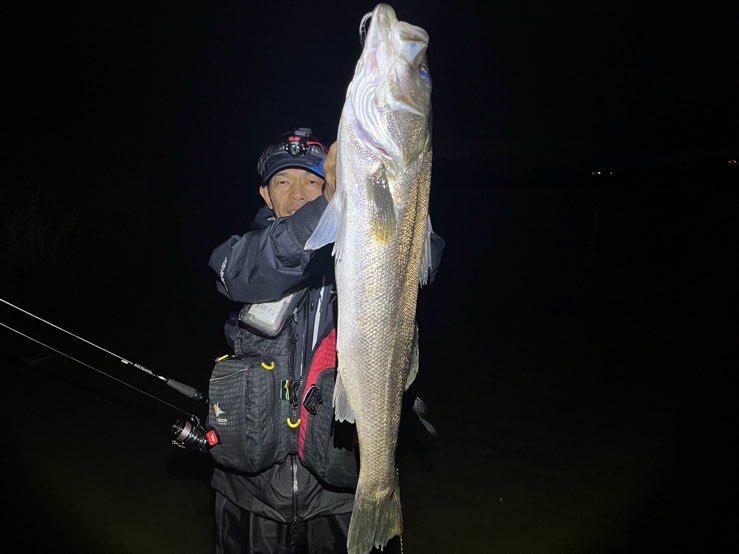 三河湾べシーバス釣りに行きました。釣り場で知人と会い一緒に釣りをする事にしました。最初にヒットしたのは知人でした。ヒットルアーはカゲロウ。上がったのは50cmくらいのシーバスでした。私は逆にローリングベイトで少しだけレンジを入れて巻いていると狙い通り食ってきました。似たサイズのシーバスでした。更に知人が追加でヒット。これも同サイズでした。ワスプスラロームに変えるとスコンっという吸い込む様な明確なアタリが出ました。アワセを入れるとまぁまぁロッドが絞り込まれたので良い型だと思いちょっと強引に寄せてキャッチしたのは75cmのシーバス。久々の70cmオーバーだったので満足です
