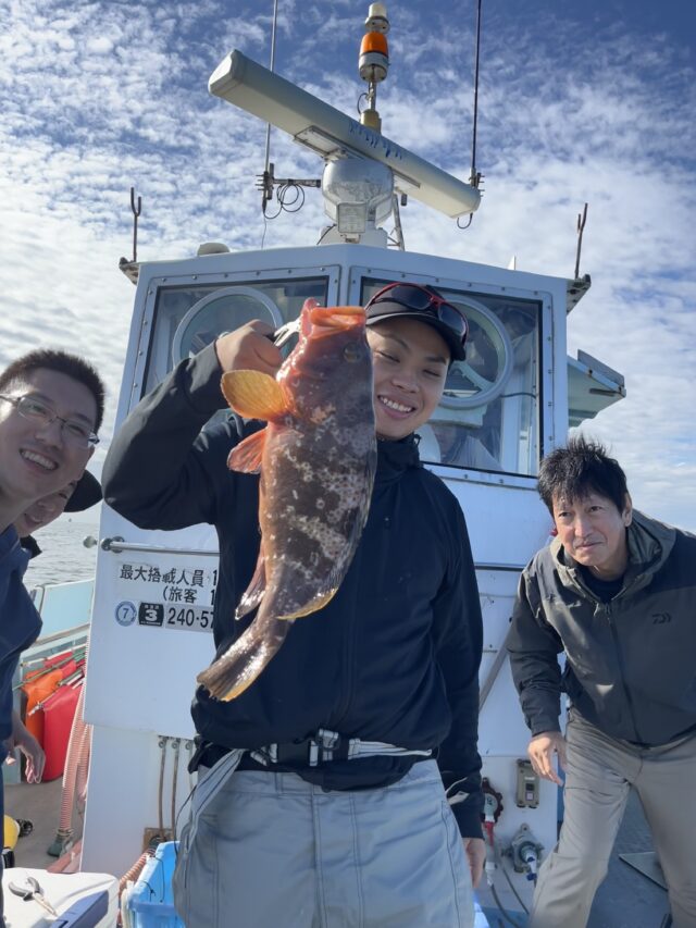 そこでアジが釣れ、こっそり私一人泳がせの準備。皆さんウタセやっている中、突然前あたりからの竿が入り込みました。あまり走らないので、青物ではないなと。では何だ?上がってきたら、なんとキジハタ。正直びっくりしました。。。