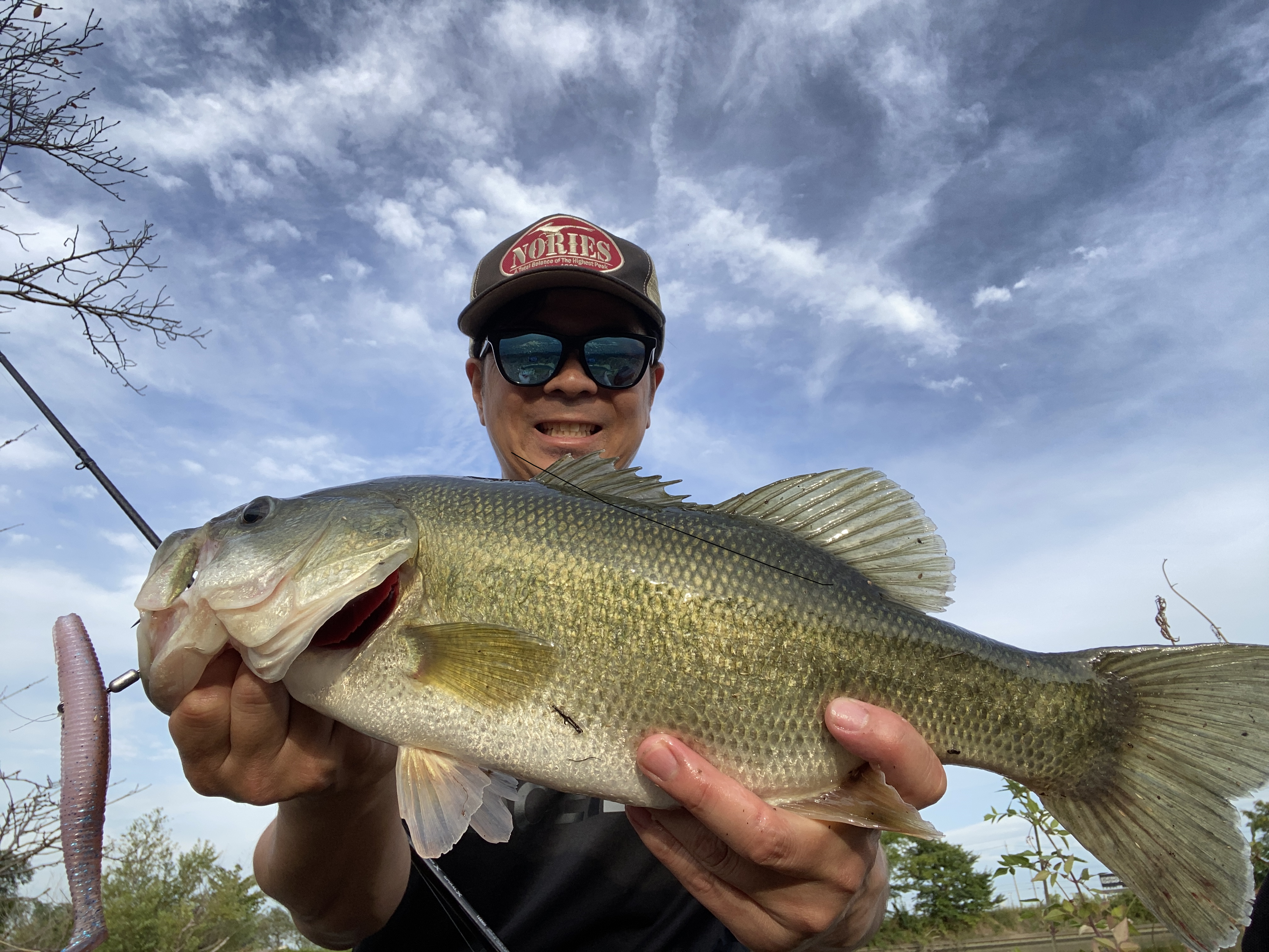 昼過ぎに到着し、巻物中心で探りますが、反応なし。ベイトのイナッコは小さな群れであちこちで水面を泳いでいます。とくにボイルもなく、ライトリグなど入れていくも子バスのバイトのみ。ランガンしながら様子を見ていきますが、まだ夏を引きずっているのか、ベイトに執着がない感じ。かといって、シェードなどのカバーに依存もしていない微妙なコンディション・・・夕方になれば状況は変わるかもしれませんが、探り探りで選んだのがゲーリーヤマモト、ハートテールのウエイテッドリグ。シャローフラットが広がるエリアで、とにかく広くゆっくりと探ることに。すると、ココンとバイト!重みを少し感じたので思い切り巻き合わせ!なかなかの重量感!上がってきたのは45センチ!満足したので夕方前に撤収。もう少し水温が下がってこればベイトも固まりだし、早い動きにも反応してくると思います!皆さんも秋の爆釣楽しんでください!