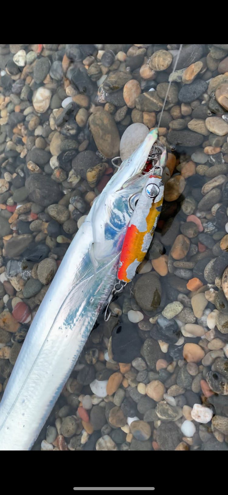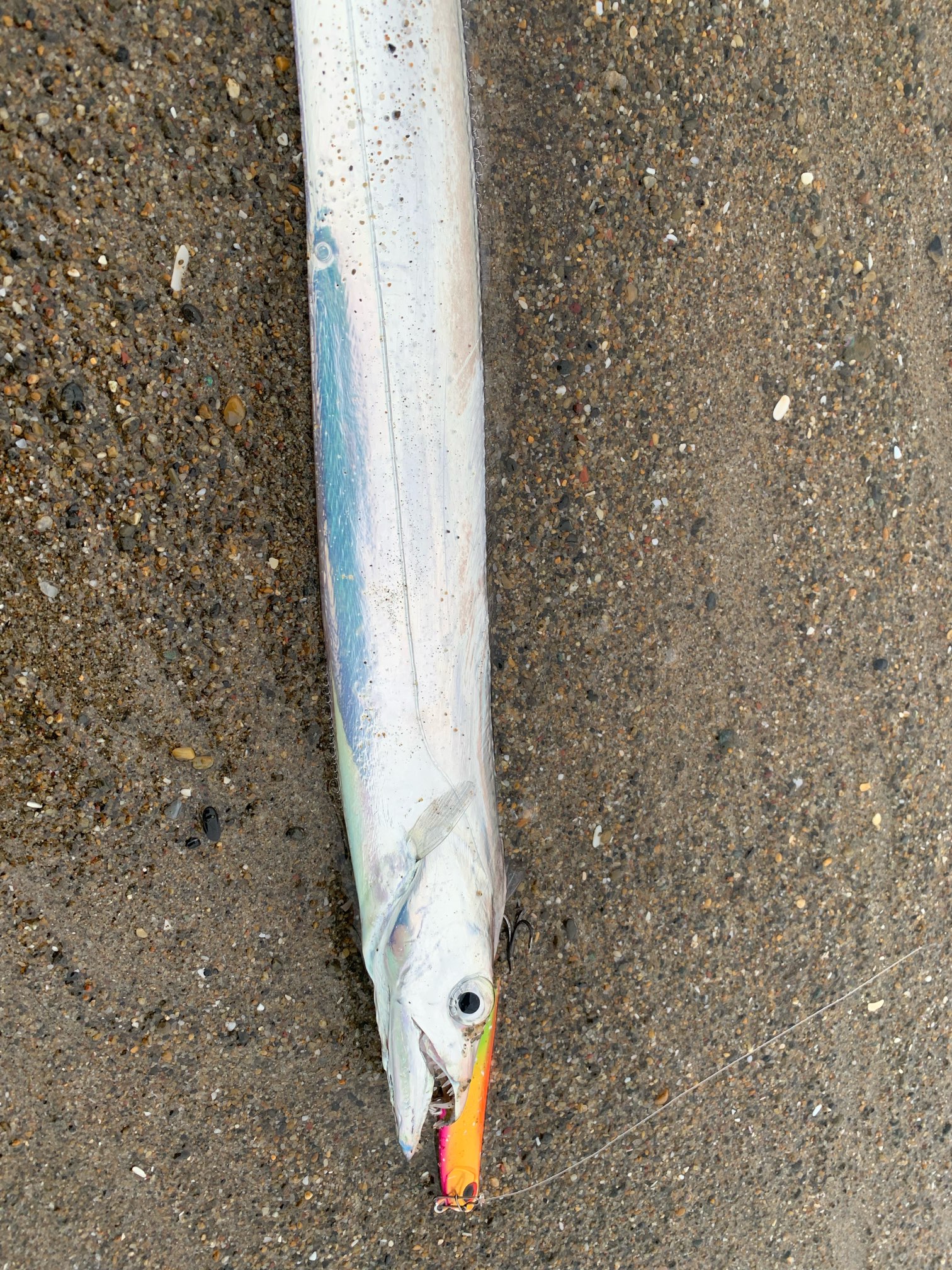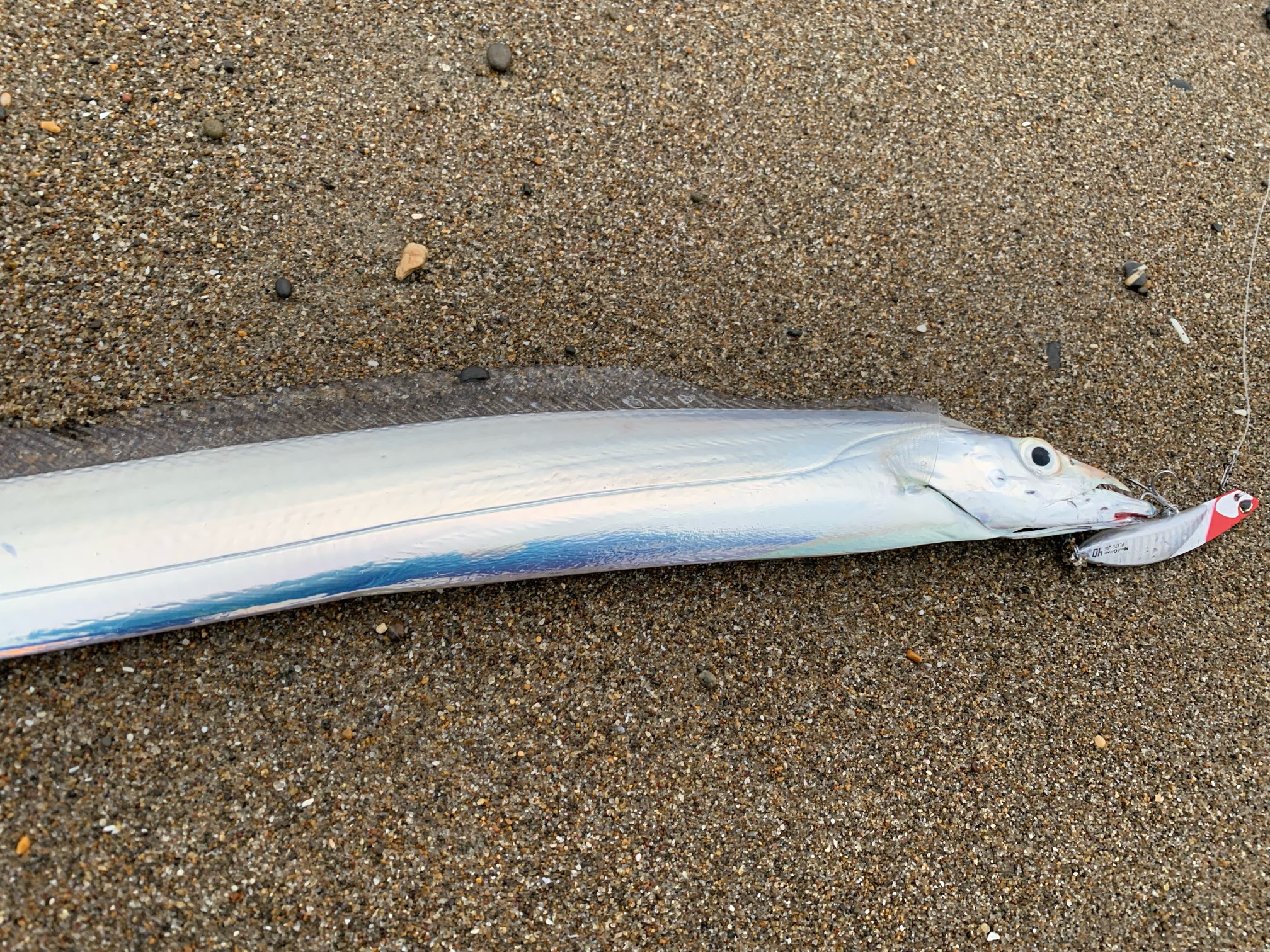 遠州サーフへ行きました。今回も朝5時過ぎからスタート。表層からサイレントアサシン140FとSで探りましたが、釣れず、ランガンしながらルアーローテーションをして行きました。リジェットで底まで沈め、巻いているとヒット。1匹目は小型のタチウオでした。次にプレートジグで指3本のタチウオを追加。フリッパーZでも追加しました。まだタチウオは水面から跳んでベイトを追っかけていたので続ければ釣れそうでしたが睡魔に勝てず終了しました。