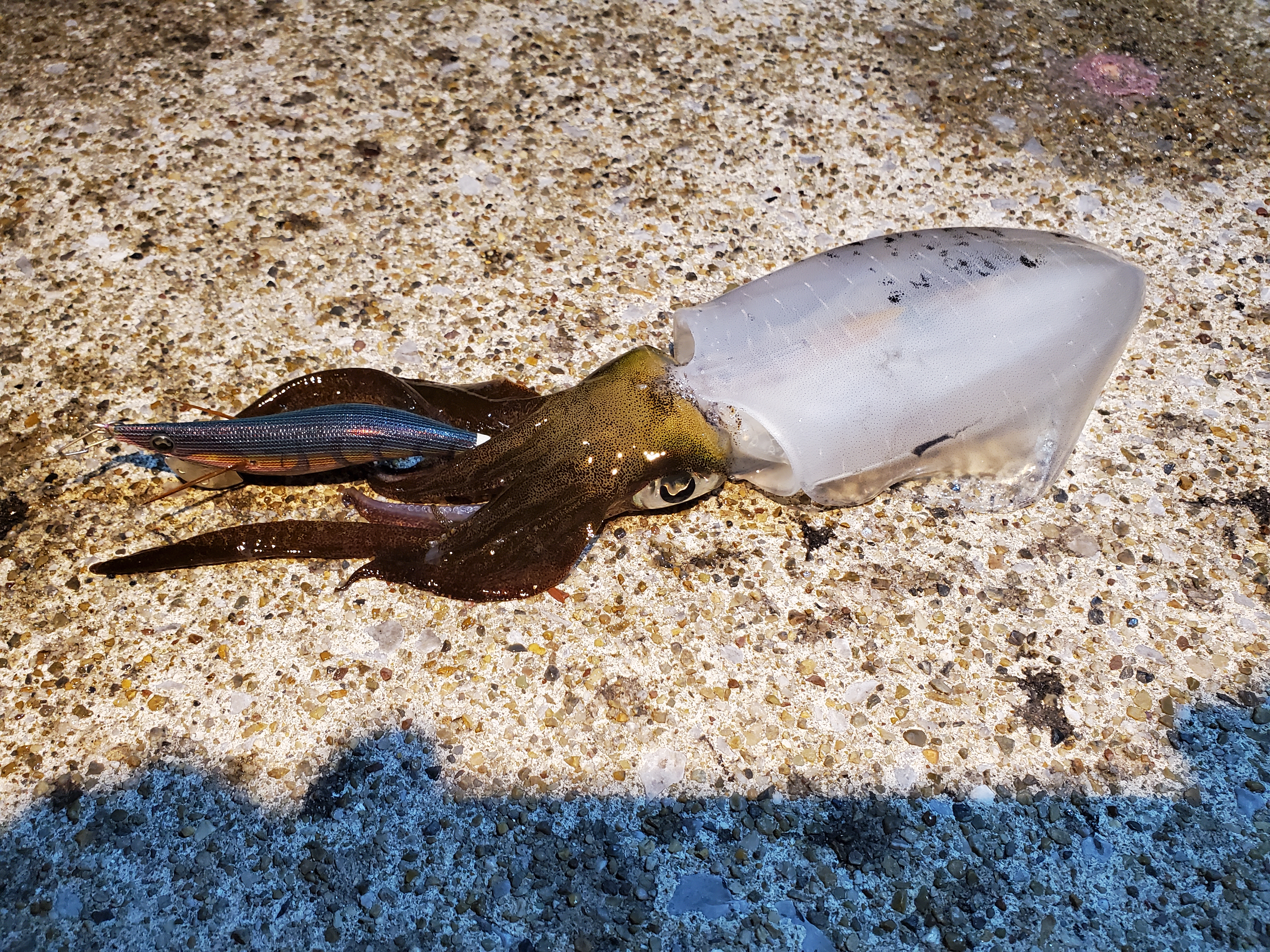 こんにちは、フィッシング遊東郷店の新藤です。同店の鈴木さんと小笠原さんの3人でアオリイカを狙いに行ってきました。先に鈴木さんと2人で狙っていると、鈴木さんが3投目でイカらしき反応をキャッチ!!その後、私もイカパンチらしき反応が!!完全に潮が下げきったタイミングで鈴木さんが良いサイズのアオリイカをキャッチ!!それを見て粘っていると自分にも反応が!!最初の1杯をキャッチ✨