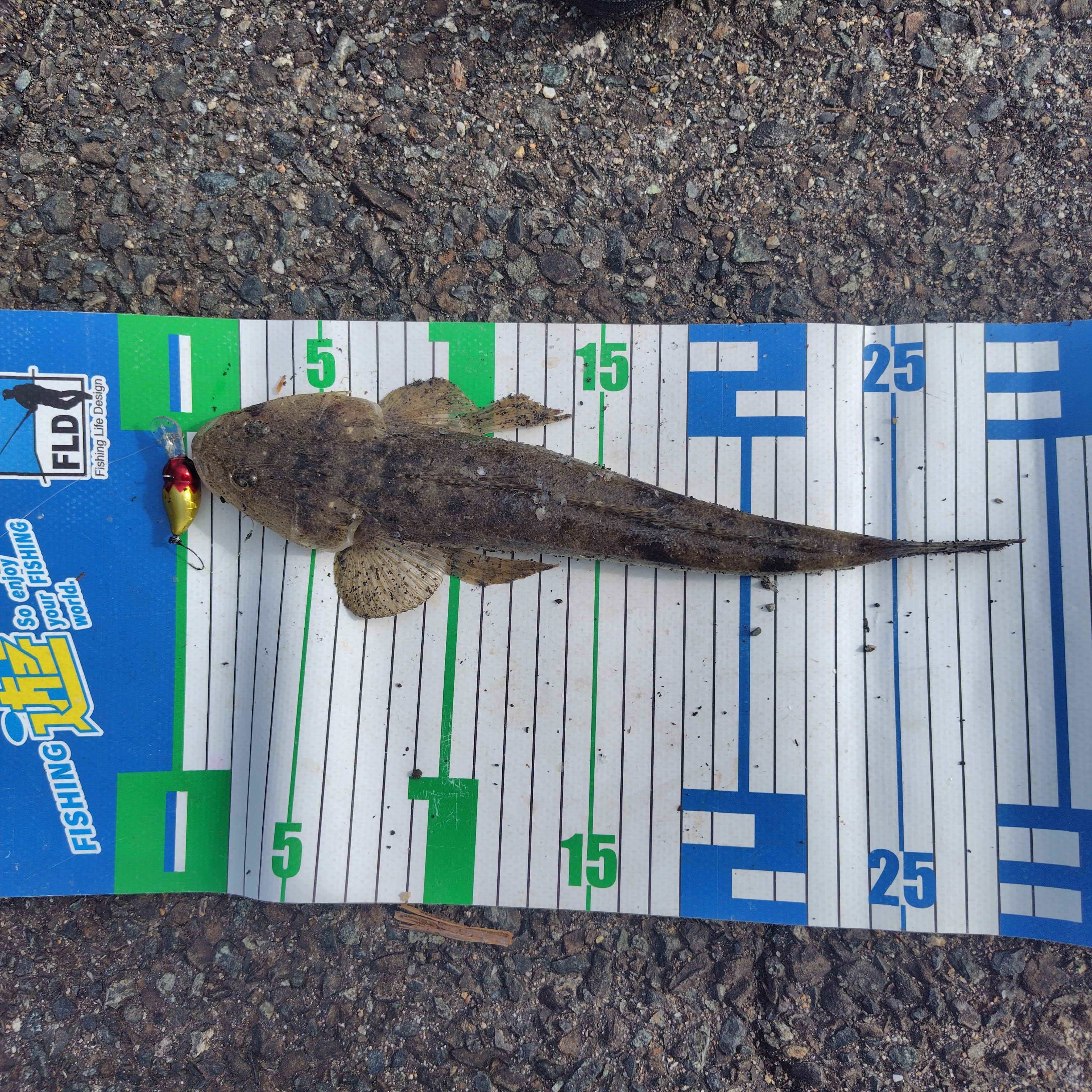 ジャッカルのエッグナッツを投げて巻いてきますとコツッ!とアタリが。さっそくハゼを。ポツポツと順調にあがります。そのあと、少しゴツッ?としたアタリがあり、巻いてきますと軽いのでハゼと思い込み油断していたら途中からギュン~と引くので少し慌てる私が(笑)慎重に寄せてくるとなんと恒例のマゴチ💦タモは今回ちゃんと準備して待機してるのに抜いてしまい⤵️