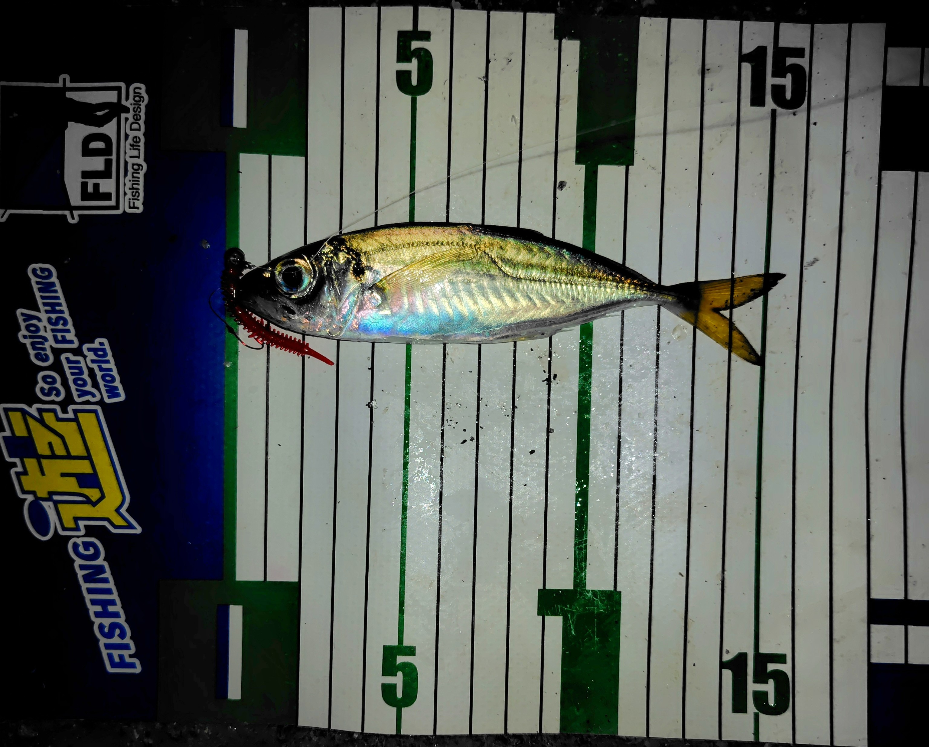ジグヘッド0.8gにエコギアのパワーイソメ中サイズ「赤イソメ」をセットして着水後2カウントくらいで巻きはじめるとカン!とアタリが。やっとアジを。なかなか小さめの14cmでした。