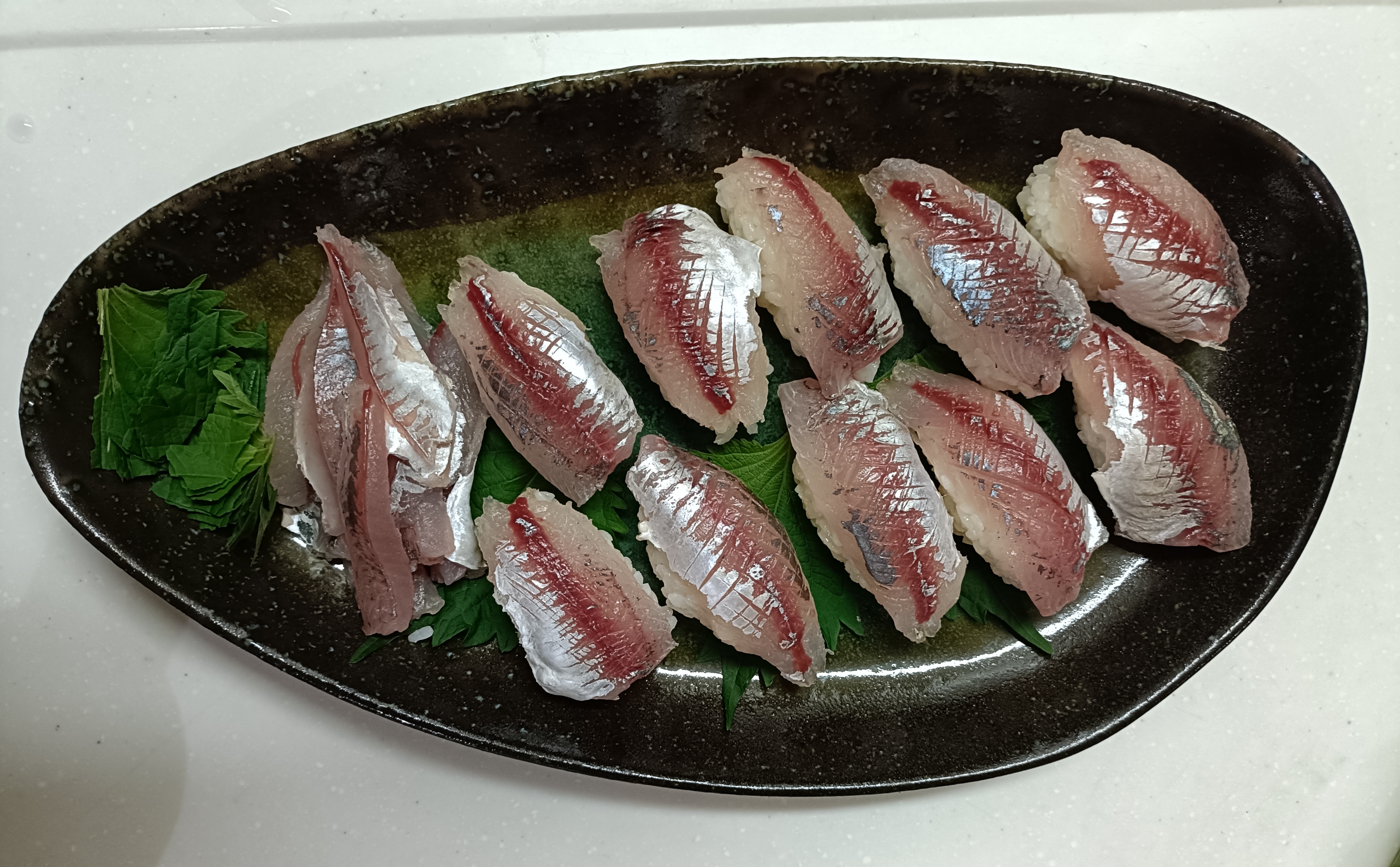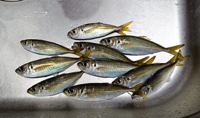 風も強く何を釣りに行こうか!?ということで…夕方の短時間サビキ釣り(^^)アジが食べたいということで決定(。•̀ᴗ-)✧短時間と言うことで…アミエビは小サイズ、サビキはいつも、ササメの豆アジサビキ太ハリス(^^)16時過ぎよりスタート!コッパグレ、カイズ、ウミタナゴなど釣れるがアジが釣れない。時間が過ぎ17時頃からアジラッシュ(☆▽☆)仕掛けが落ちない程…スレ掛かりも多い(*´ω`*)あまり持ち帰ると捌くの大変なので10匹程確保して後はリリース(^^)17時半頃に終了しました(◡ ω ◡)帰宅後に寿司&刺身&タタキで美味しく頂きました(。•̀ᴗ-)✧