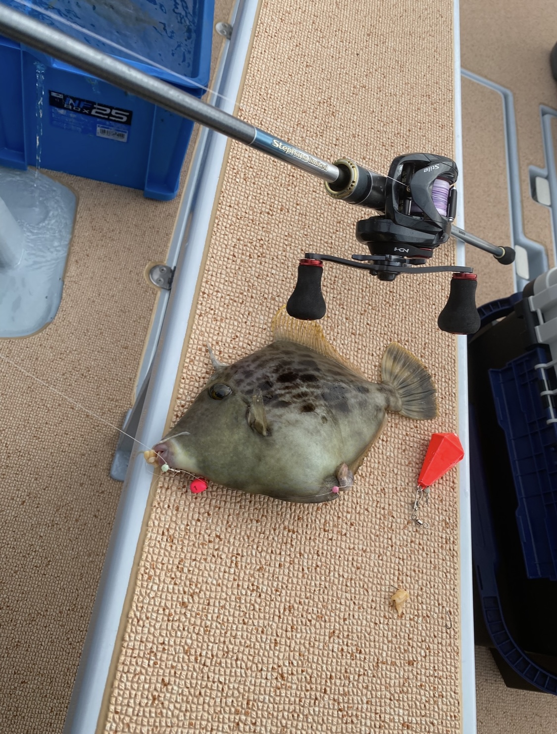毎度おなじみの志摩はほっぺ毛丸さんでカワハギ釣ってきました!釣果はカワハギ18枚で、この日はボトムよりチョイ宙の釣りがハマりました。ボトムはベラなど外道が多かったので底から50cm位までを意識して誘います。ボトムだと外道、50cm以上だと当たりが出ない状況でしたが新製品のステファーノリミテッドM175がいい仕事をしてくれました!手感度、目感度共に高次元のため前当たりをしっかり感じて食わせの間を作れました!カワハギなら名古屋北の西までお声がけください!