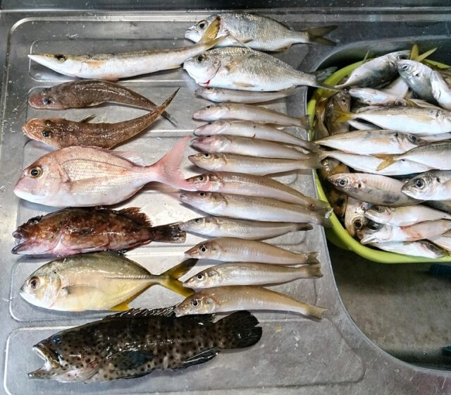 空が明るくなりかけた頃に移動して昼間のポイントに入り投げてみます。前回は朝一が良かったのですが今回は渋い!真鯛小が釣れクロサギがポツポツなので一端休憩して昼過ぎから投げてみると 遠くでオオモンハタのフグ移動して遠投で探ると何か触るが食い込まないのでフックを小さめにして探ると手前でキスが釣れソコからは手前中心に探り11匹のキスが釣れました。PEラインにタングステンシンカーは浜名湖でも威力を発揮してくれましたが尾鷲方面でも効きますね。タングステンは沈みが早いのでフォールでブレーキを掛けつつ沈めていると アタリ!掛けるとアジでしばらくしてもう1匹アジが昼間に釣れましたがそれっきりでした。休憩して夕暮れにも投げてみますがワニゴチが釣れただけで昼間の釣りは終了です。