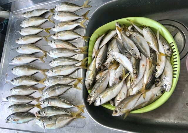 夕暮れに少し休憩してからアジ探しに向かいます。ポイントに入り投げるといきなりアジが釣れイケるか!と思わせてポツリポツリなので移動しながらアジを追加しながら動きながらで何とか釣果を上げようと頑張りますが徐々にアタリが減って来たので一気にエリアを変えます。次の場所は小型が多いですが数が出るので期待して入ったのですが10匹ほどしか釣れずこの時点でアジ58匹と二晩合わせても微妙な数なので1発勝負で今シーズンはまだ入っていないポイントに向かいます。すぐに投げ始め2投目でアジが釣れアジの群れの広さを確認する様に広く投げて薄く全体に居るので立ち位置を替わり確実に捕りにイキます!ウエイトを上げ遠投でまずは水深チェックで11カウントで底に触るので10までで魚を探し3で当たったり5で当たったり7で当たったりとすぐにレンジが変わるのとタダ巻きと誘いで食いが変わるのでアレコレ試しながら頑張り後半だけで64匹を釣り 久しぶりに気合入りまくりでアジを釣りました。