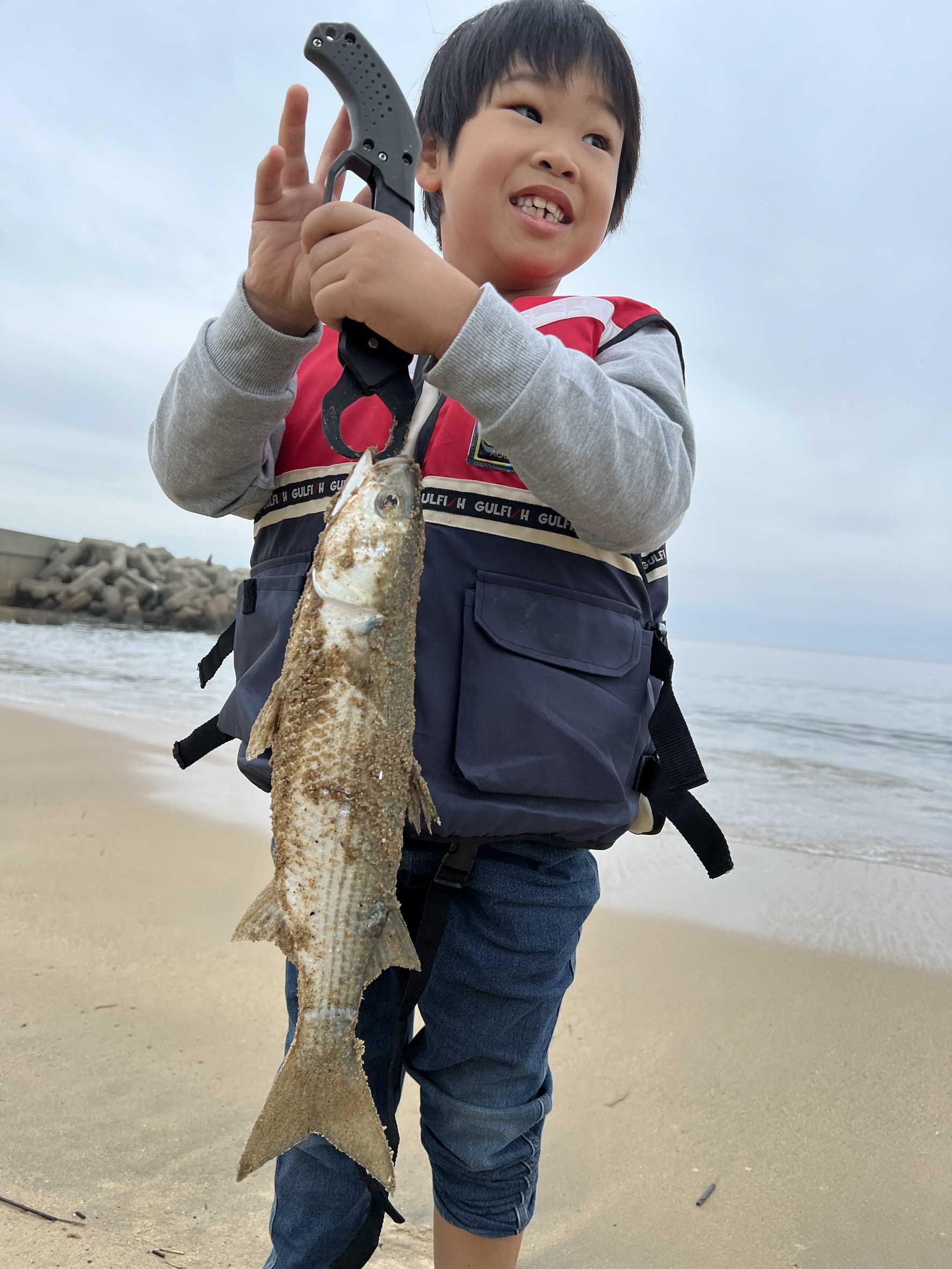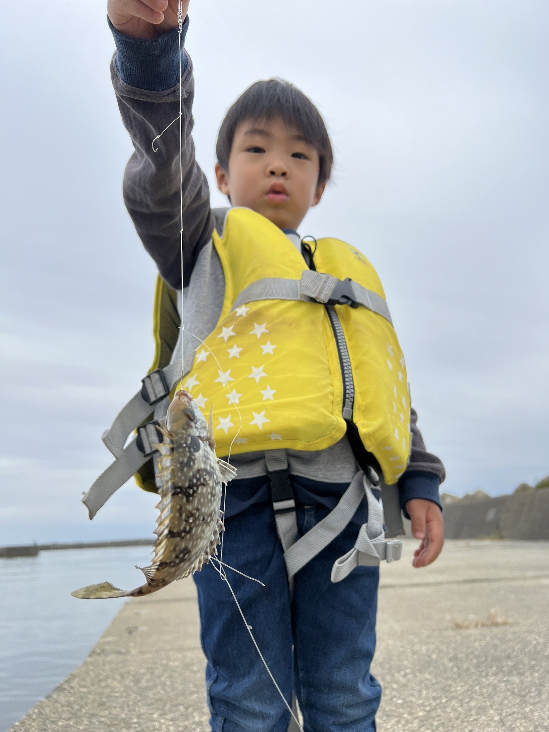 堤防を歩いていると小さな魚発見。エサのオキアミ落とすとつついてくるので釣ってみたらアイゴでした!トゲに毒があるので注意です!空いているところで竿を出して置き竿にして待ちます。気がついたらグワングワンと竿が揺れていました。上げてみると20センチほどのグレ!同じサイズが連続で3匹釣れました。同じやり方でカサゴは8匹ほど釣って終了。帰り際にボラも釣れました。
