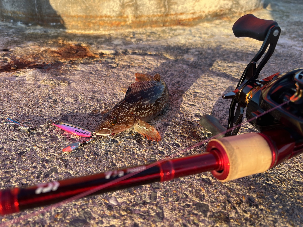 なるべく遠くの岩場にキャストすると、着底と同時に当たり!かわいいサイズのアイナメが上がってきました!時間になったので終了!