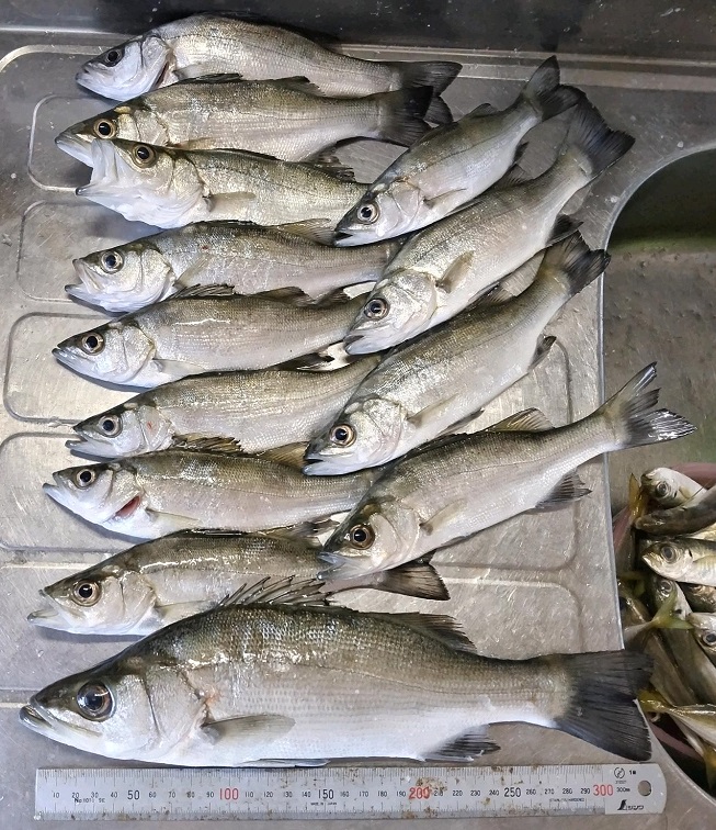 本題の尾鷲方面ですが 雨絡みで釣りにくい状況でしたがまずはセイゴを確保に向かいます。投げ始めるが反応が出ず探り歩いてやっと1匹確保 更に歩いて小さな群れを見つけポツポツ追加釣り場を折り返して始めに釣れた場所に差し掛かると調子良くセイゴが反応して追加出来ました。18匹釣ってアジ探しで移動して投げるとすぐにポンポンと釣れるのですが群れが薄く連発に持ち込めずセイゴ同様足で稼ぎ何とか21匹、そして大きなセイゴが居たのでアジの泳がせをしてみます。アジを深めに泳がせたところでギラッ!と魚が見えた割には地味に食って— 離される、まだアジが何とか泳いだので即同じ場所で引っ張ってアジにヒラを打たせると食って来ました!少し待ちラインを張りに行くと一気に走ってジャンプ!からのエラ洗いと大暴れをする魚をネットに入れ確保です。場が荒れたので移動してアジ探しに向かいますが30匹ほど釣り一晩目は終了です。