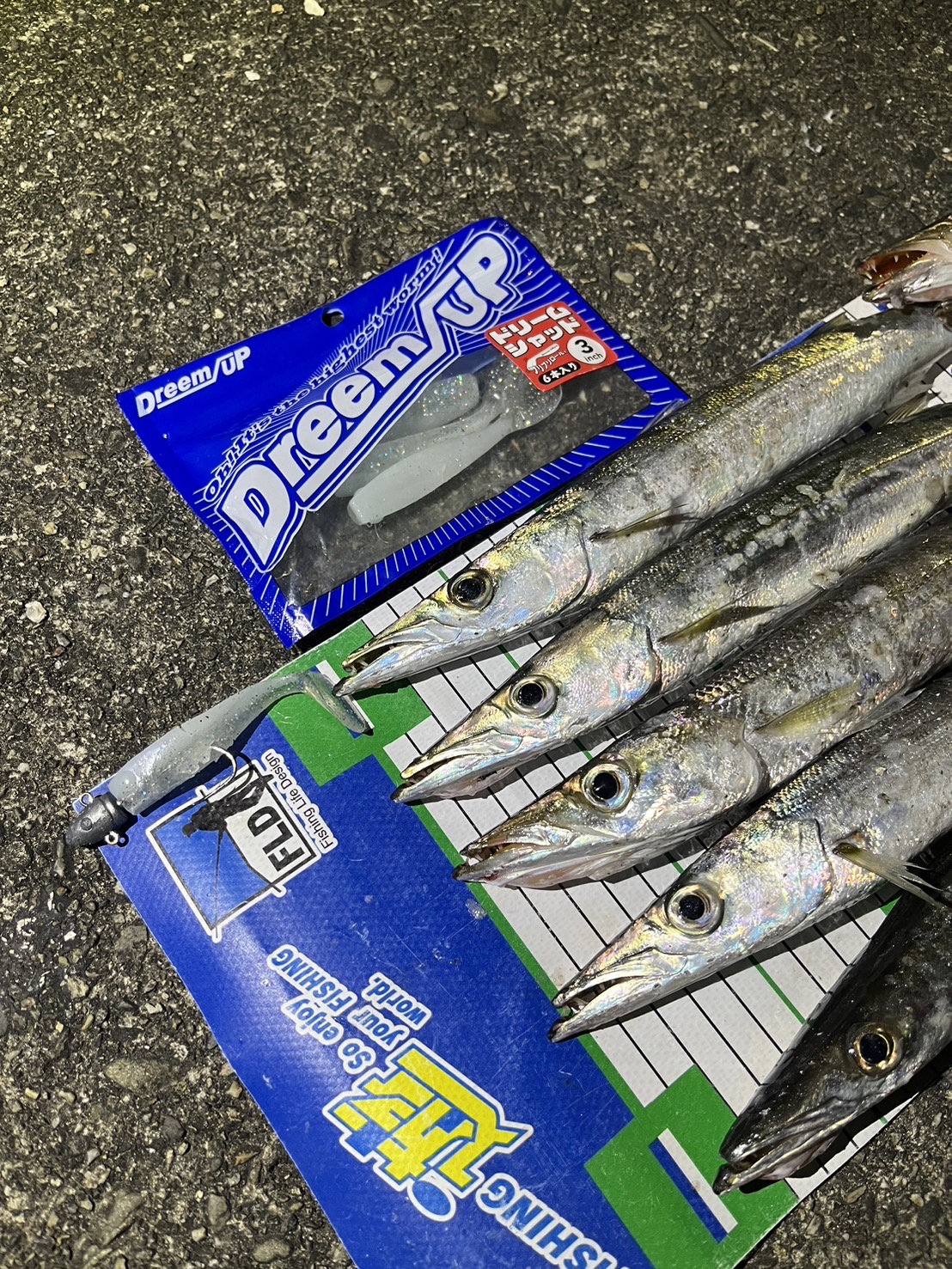 エコギア「3Dジグヘッド7g」に、ドリームアップ「ドリームシャッド3インチ」アラハダグローです。3Dジグヘッドは、ラインを結ぶところが上下についています。カマスを狙う時には、針先が下を向くようにセッティングしています!