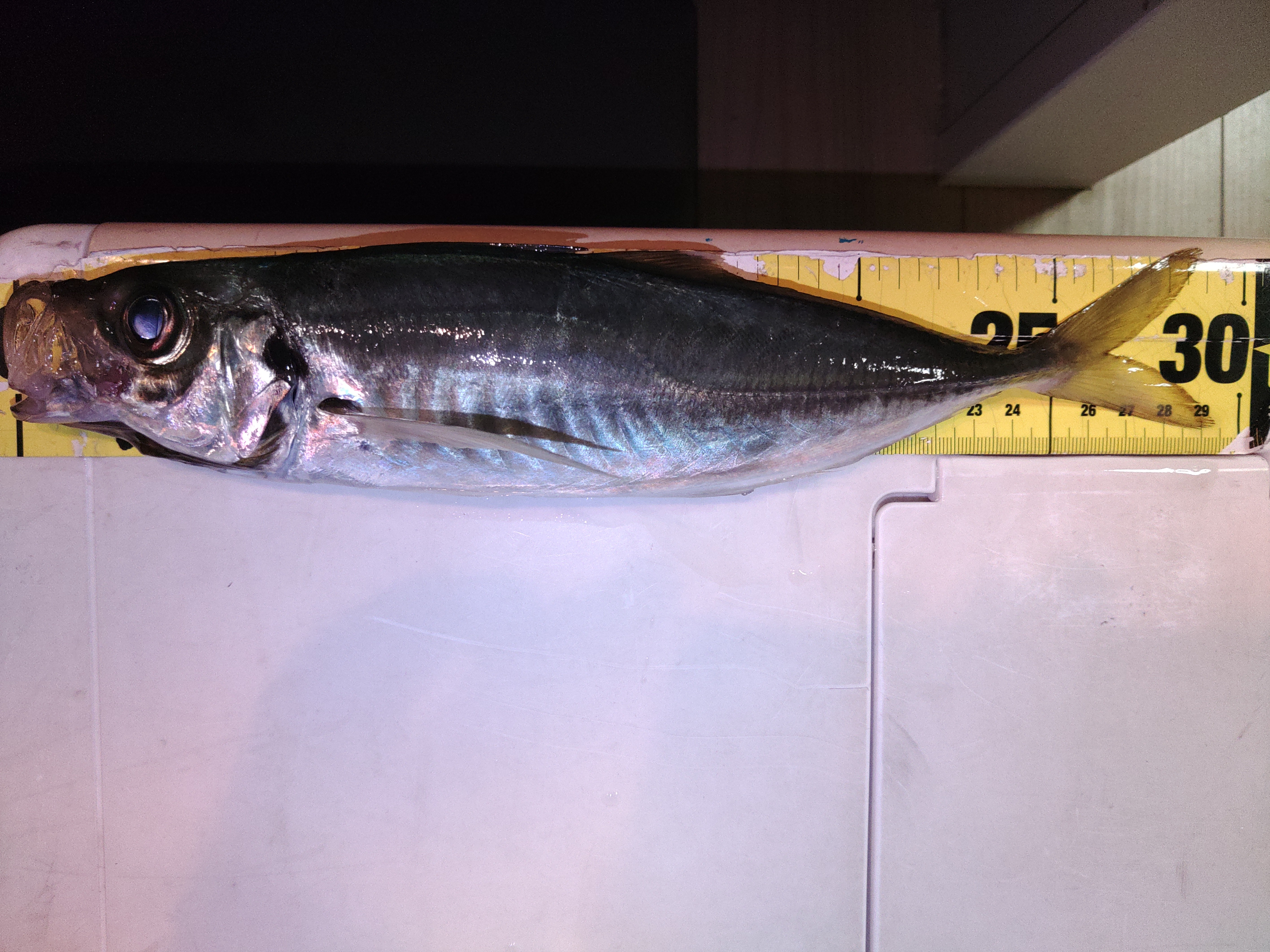 当初、静岡に釣行予定でしたが悪天候の為中止となり、急遽和歌山県白浜の丸十丸さんへタテ釣りと中深海のオニカサゴ釣りへ釣行してきました。 AM6:00に港を出船し水深80mのポイントからタテ釣りスタート! しかし、なかなかベイトが付かずポイント移動。 何度かポイント移動を繰り返しようやくベイトのアタリがありました。 しかし、横で釣っていたG先生にもベイトが付いたが何かおかしい? 巻き上げてみてみると30㎝ぐらいのアジが3匹釣れていました。 デカすぎるので自分も仕掛けを巻き上げると30近いアジが付いていました。 しかし、その直後ミヨシで釣っていた人の竿がひん曲がっていました。 釣り上げた魚を見ると80cmオーバーのブリでした。 30㎝ぐらいのアジを丸のみ! 勇気を出してそのまま泳がせていたら釣れていたかも・・・ その後アタリも無くなったので中深海でオニカサゴ釣りにチェンジ!