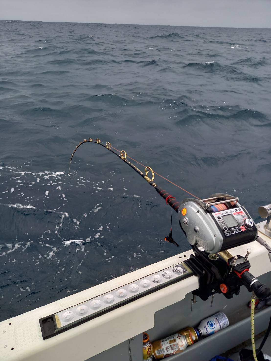 同船者の竹屋さんはジギングで底付近を探ります。竹屋さんが急に根掛かりのような感じ・・・しかし、巻ける⁇強引にリフトして回収を2回ほど繰り返すと糸の先から生命感。こいつはデカそうだ。ここから600mの長距離&長時間ファイト。残り200mと100m付近で強烈な引き。