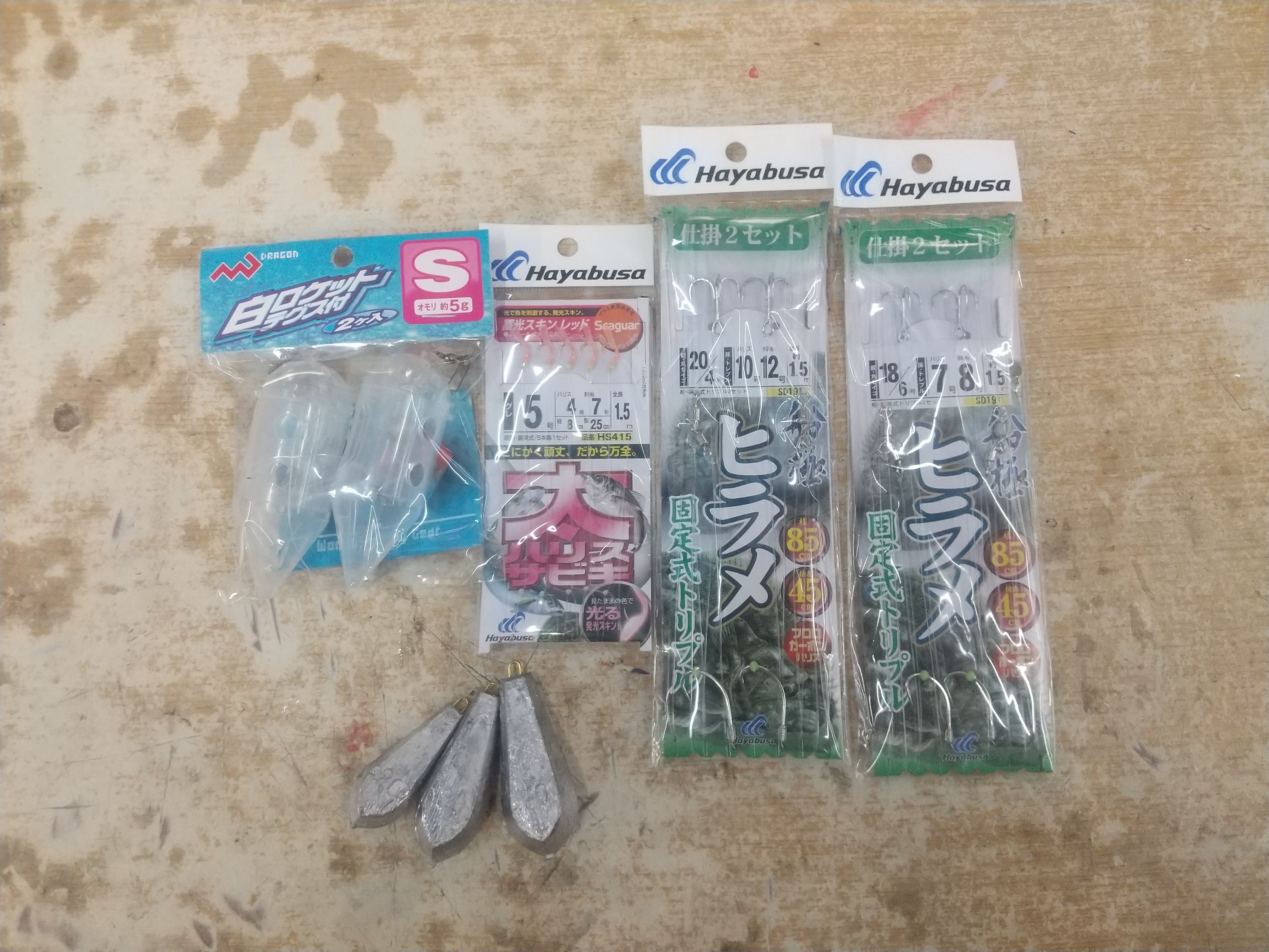 タックルは、ZEALOT SOLID Lighting195Hにプレイズ600(浅いポイントが多いので手巻きでも可)、道糸はPE3号200mを使用。仕掛けは、サビキ仕掛け(太糸仕様、サビキロケットSとオモリ20号)と、ヒラメ・青物用の泳がせ仕掛け(ハリス7号、オモリ40号。青物用でハリス10号もあった方が良い)を使用しました。サビキ用のコマセは船で用意してもらえました。氷は販売もないため持参しましょう。