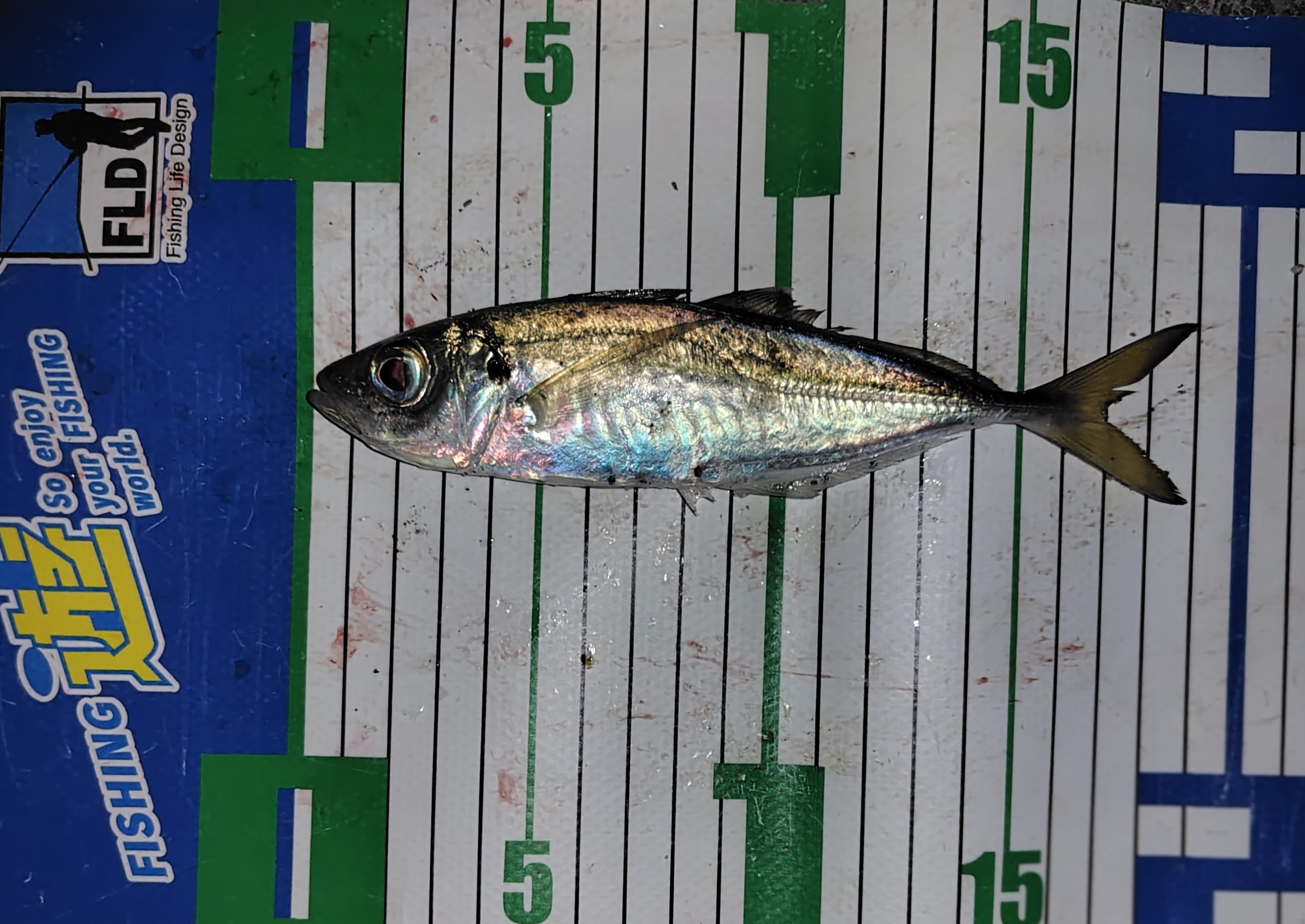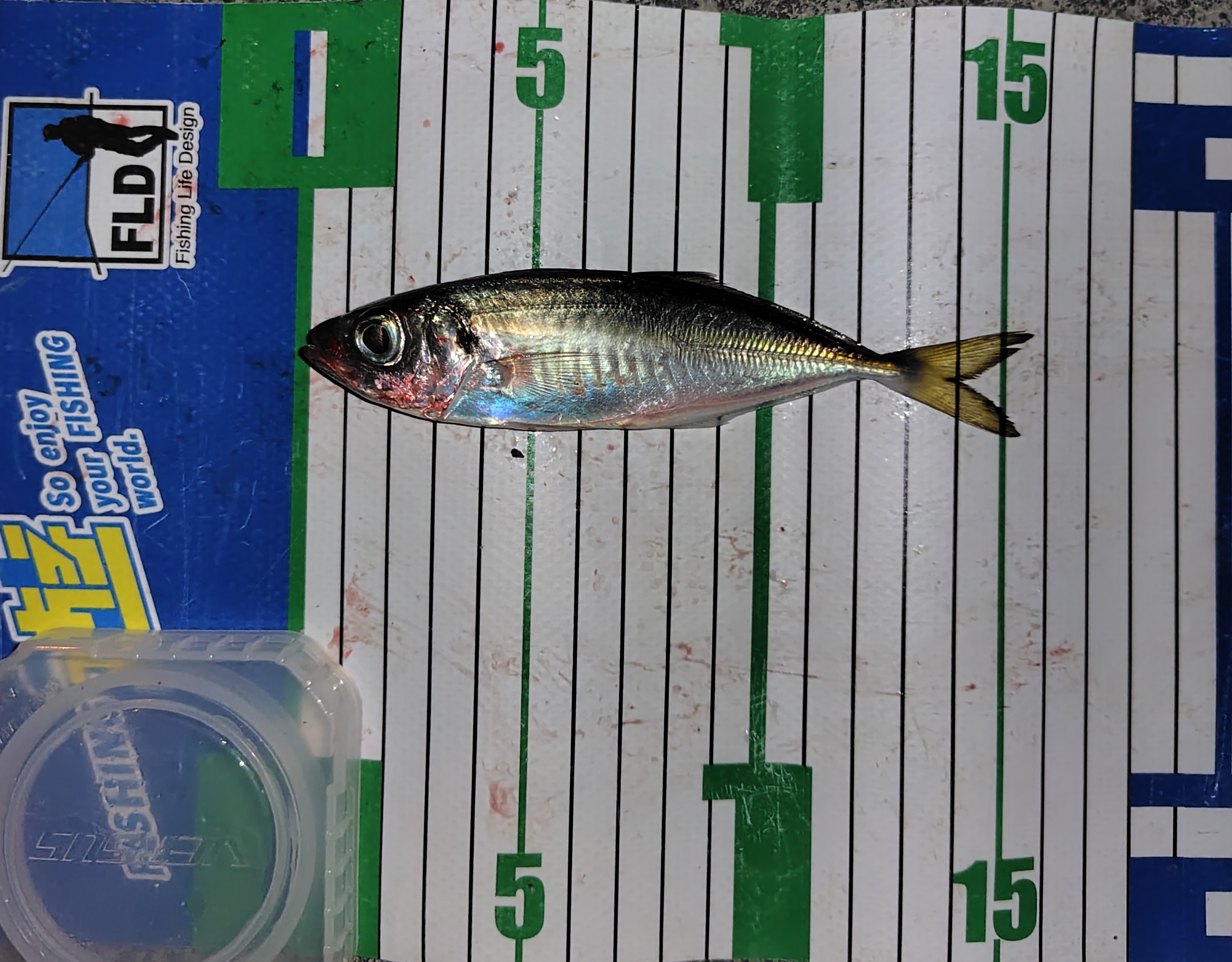 ザ豆の0.5gにチビキャロスワンプのグローバブルガムをセットして着水後タダ巻きしてみた。すぐにコッと当たって15cmほどのアジを。少ししてちょっと引く感じのアタリがあり19cmのアジを。そんな感じでポツポツとフグ🐡を交えながら15〜19cmクラスを。